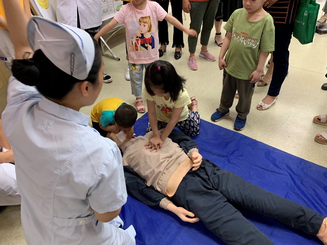 活動的尾聲,學(xué)生們現(xiàn)場為大家展示心肺復(fù)蘇的操作流程,并解釋“黃金4分鐘”的重要性,普及應(yīng)急救援知識和實際救援技能。