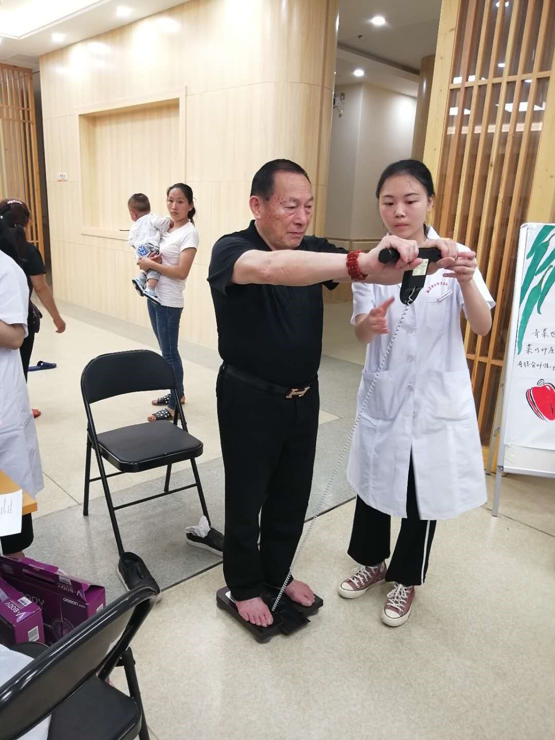 在隨后開展的義診活動中,學(xué)生們熱情地為老人們測量血壓、BMI、體脂率、內(nèi)臟脂肪指數(shù)等數(shù)據(jù),并詢問調(diào)查日常生活健康信息,為其評估健康風(fēng)險;特邀的幾位專家,根據(jù)評估情況,為老人們提供醫(yī)療服務(wù)。