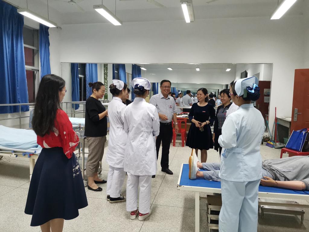 10月23日,學(xué)院黨委曾武祈書記在護(hù)理系黨總支謝濤書記、護(hù)理系龔海蓉副主任的陪同下到護(hù)理系實訓(xùn)室訓(xùn)練現(xiàn)場看望慰問正在備戰(zhàn)全省護(hù)理職業(yè)技能大賽的精準(zhǔn)扶貧班參賽選手。