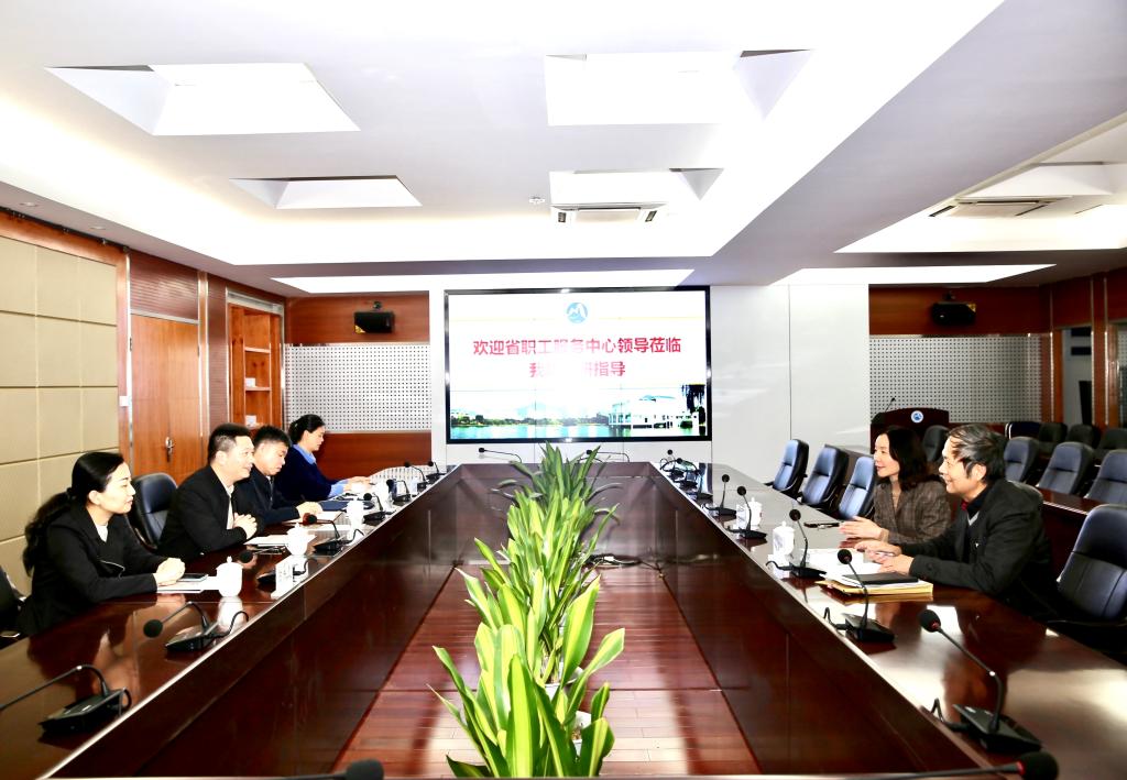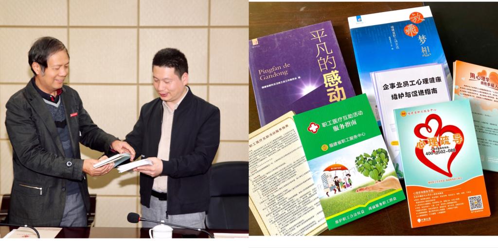 江云向我校贈送了《職工醫(yī)療互助活動服務(wù)指南》《企事業(yè)員工心理健康維護(hù)與促進(jìn)指南》等學(xué)習(xí)宣傳資料,希望我校發(fā)揮醫(yī)學(xué)院校專業(yè)特色優(yōu)勢,與省職工服務(wù)中心聯(lián)合面向社會開展職工心理健康服務(wù)工作。