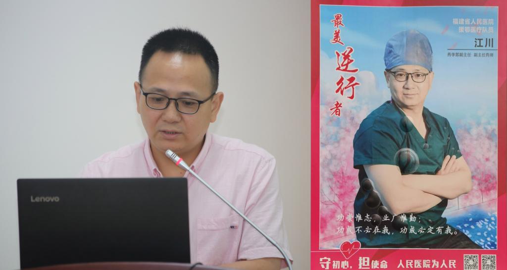 游鋒強調(diào),近年來在校黨委的正確領(lǐng)導及教務(wù)處的大力推動下,我校課程思政開展得有聲有色,但校院深度合作探索課程思政育人尚不多見,福建中醫(yī)藥大學附屬人民醫(yī)院藥學部是我校藥學院的優(yōu)質(zhì)實習點,擁有優(yōu)秀的思政育人氛圍,不論是江川同志的援鄂經(jīng)歷還是藥學部的日常工作,其中都有不少思政素材可以挖掘,應(yīng)將它們提煉并融入教學,提升育人成效。他希望大家充分認識優(yōu)質(zhì)實習單位在育人中的重要作用,不斷加強校院合作,將為黨育人、為國育才的工作做得更好。