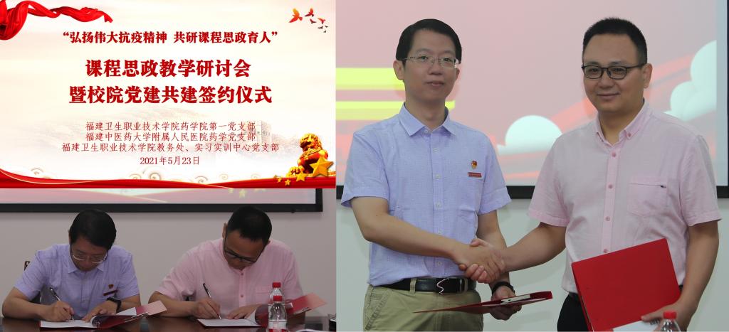 活動伊始,藥學院第一黨支部書記何舒瀾與福建中醫(yī)藥大學附屬人民醫(yī)院藥學黨支部書記江川共同簽署結(jié)對共建協(xié)議書,在與會黨員的見證下鄭重承諾:將從抗疫精神中共同凝練優(yōu)秀精神基因,共研課程思政、共探思政元素、共建思政資源、共育思政能力、共評思政成效,以生為本,共商共議,校院互補,優(yōu)勢疊加,探索構(gòu)建“校院思政育人共同體”,共同打造課程思政示范項目。