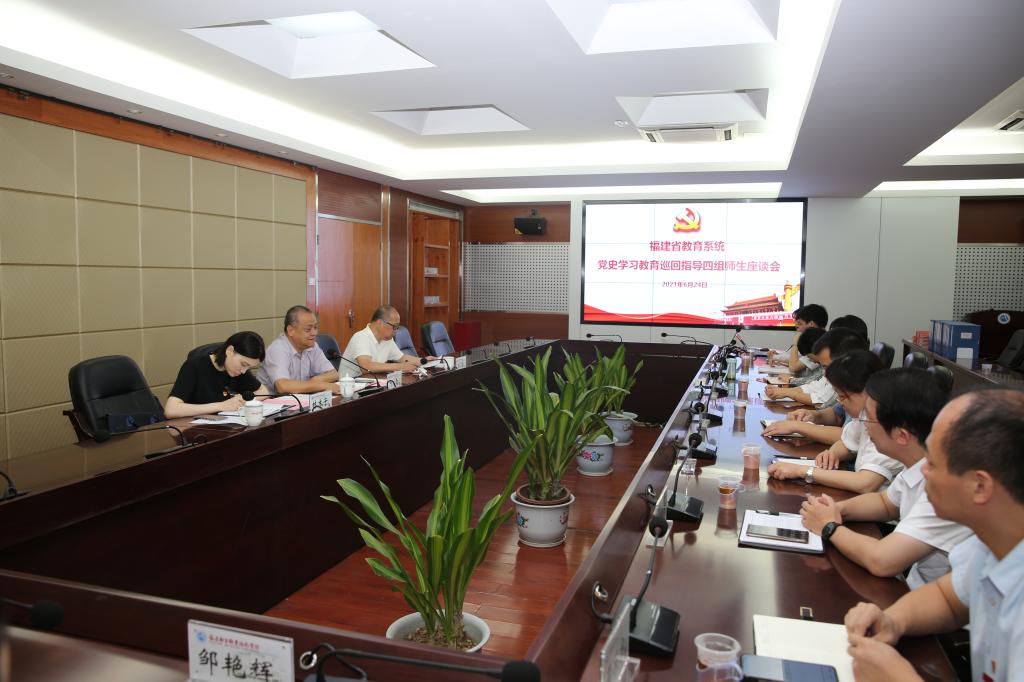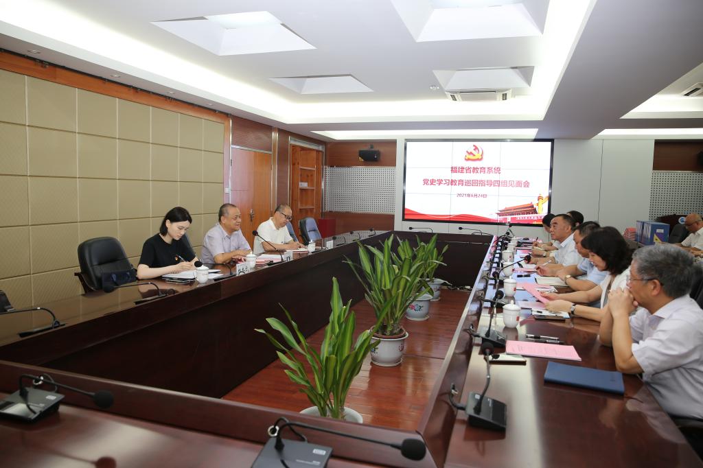 6月24日,福建省教育系統(tǒng)黨史學(xué)習(xí)教育第四巡回指導(dǎo)組副組長葉青處長、高磐副部長、林木子老師一行蒞臨我校指導(dǎo)黨史學(xué)習(xí)教育工作。校黨委班子成員、校黨史學(xué)習(xí)教育指導(dǎo)組成員、二級黨總支(直屬黨支部)書記共22人參加見面會。