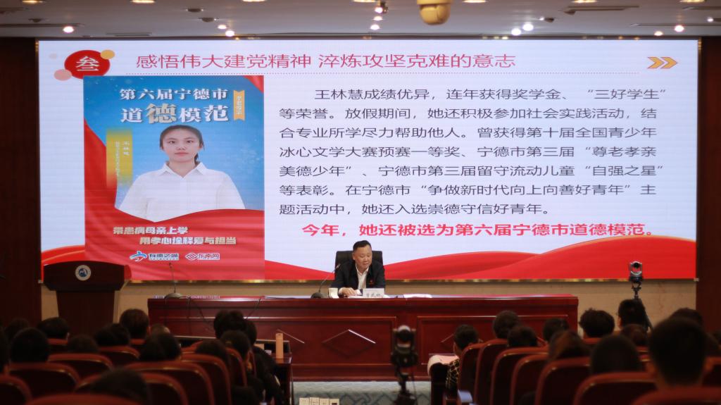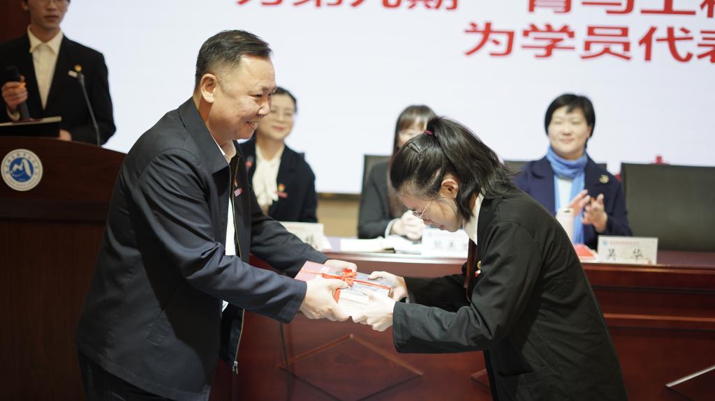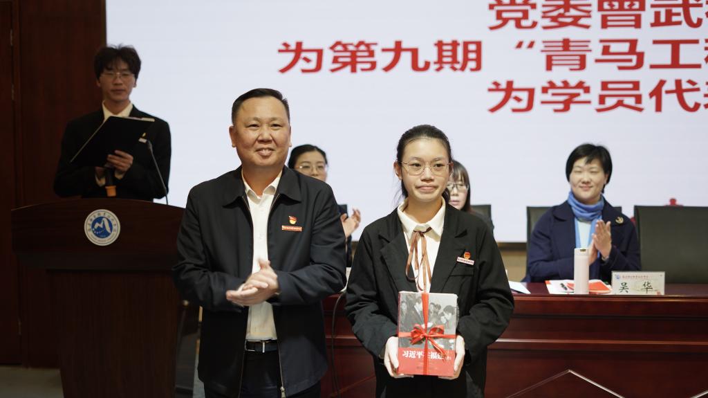 曾武祈為第九期“青馬工程”培訓(xùn)班授旗并贈(zèng)予學(xué)生代表《習(xí)近平在福建》系列書(shū)籍,勉勵(lì)青馬學(xué)員從習(xí)近平總書(shū)記在閩工作的點(diǎn)點(diǎn)滴滴中磨礪自我,篤定共產(chǎn)主義信仰。