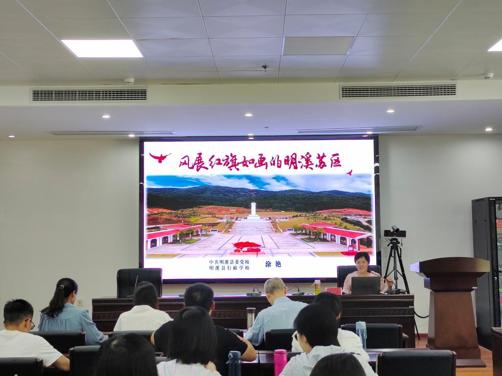“寧化、清流、歸化,路隘林深苔滑。今日向何方,直指武夷山下。山下山下,風(fēng)展紅旗如畫?!币皇酌珴蓶|同志的《如夢(mèng)令·元旦》讓馬院教師重回革命戰(zhàn)爭(zhēng)年代如火如荼的斗爭(zhēng)場(chǎng)景,重溫革命先烈用鮮血和生命鑄就的蘇區(qū)精神。在理論教學(xué)環(huán)節(jié)中,明溪縣委黨校高級(jí)講師涂艷為馬院教師作《風(fēng)展紅旗如畫的明溪蘇區(qū)》專題講座。她從“路隘林深苔滑——血與火的革命實(shí)踐”“風(fēng)展紅旗如畫——譜寫時(shí)代的新篇章”兩部分為教師們上了一堂生動(dòng)的黨史思政課。