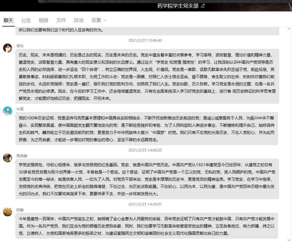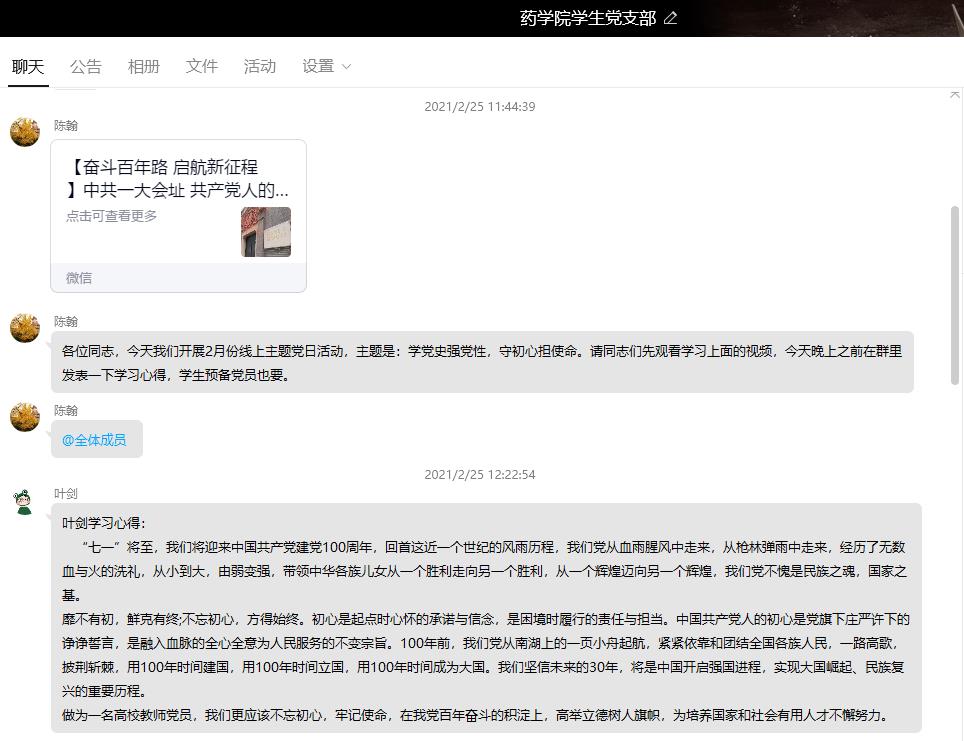 2月25日,藥學(xué)院學(xué)生黨支部組織開展“學(xué)黨史強(qiáng)黨性、守初心擔(dān)使命”主題黨日活動(dòng),支部黨員集體觀看“奮斗百年路 啟航新征程”短視頻,支部書記陳翰主持活動(dòng)。