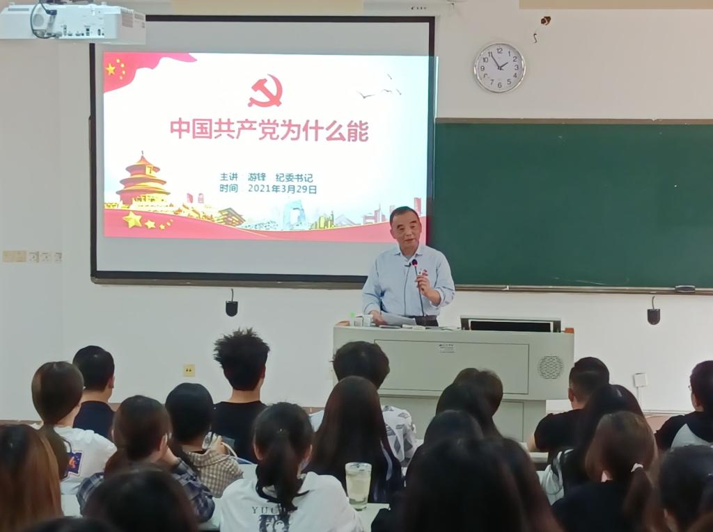 2021年3月29號(hào),我校紀(jì)委書記游鋒以“中國(guó)共產(chǎn)黨為什么能”為主題,在教學(xué)樓110教室給20級(jí)藥學(xué)301、302班的學(xué)生開展一場(chǎng)別開生面的“開學(xué)第一課”,通過(guò)深入淺出的講述,加深了學(xué)生們對(duì)黨史的理解和感悟。