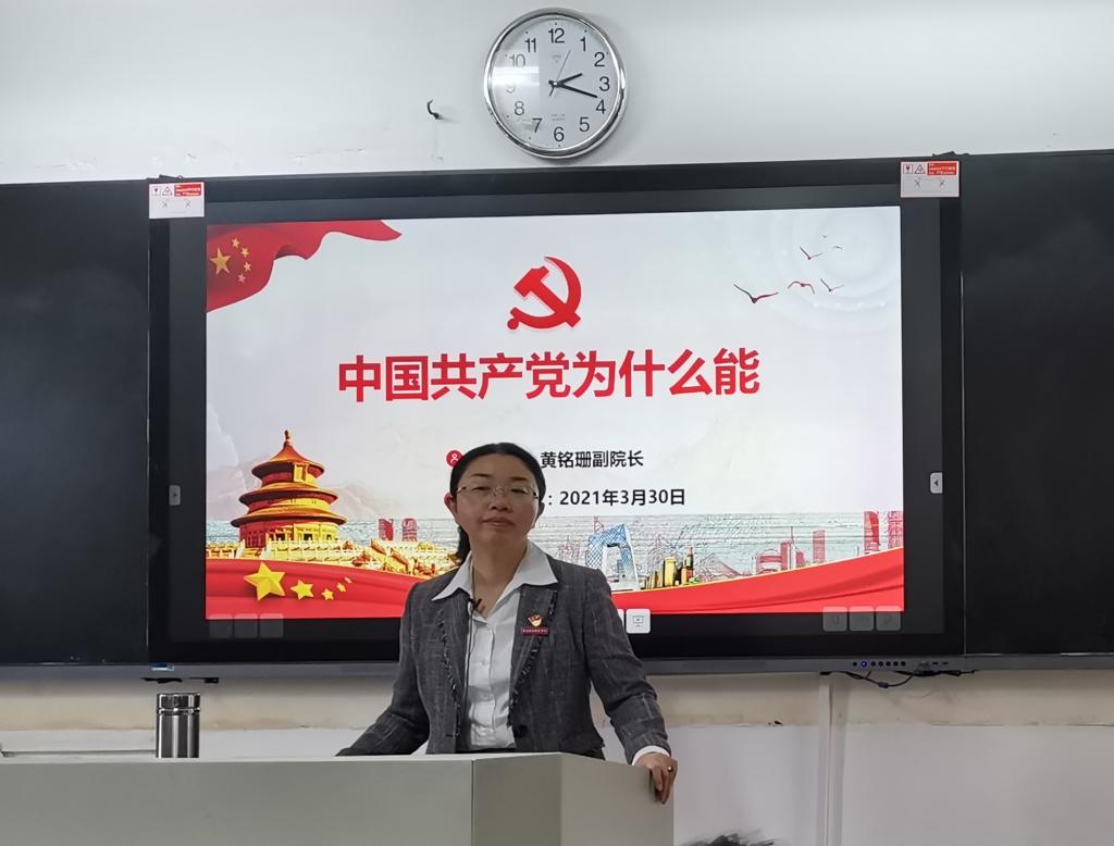 為進一步引領(lǐng)學(xué)生更好了解中國共產(chǎn)黨為中國人民謀幸福,為中華民族謀復(fù)興的偉大實踐,進一步堅定理想信念,厚植家國情懷,2021年3月30日,學(xué)校黨委委員、副院長黃銘珊在教學(xué)樓103為醫(yī)學(xué)技術(shù)系學(xué)子講授以《中國共產(chǎn)黨為什么能》為題的形勢與政策課。