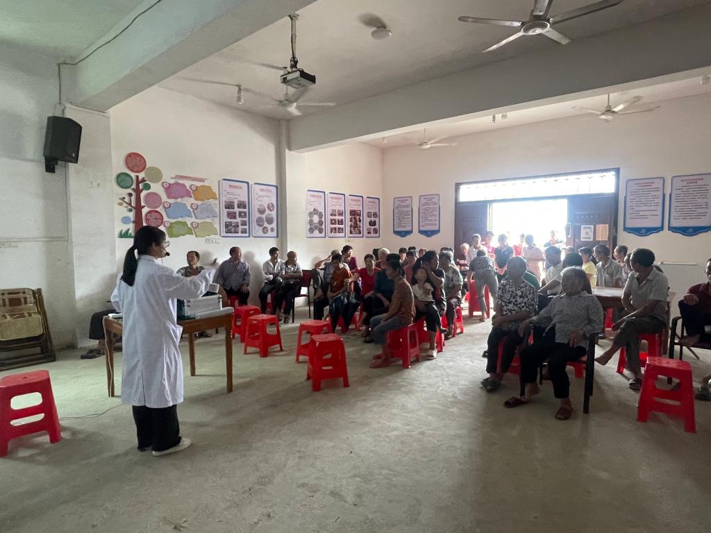 講座中,葉汝萍從“高血壓病的診斷”“五類常用的降壓藥物”“降壓藥服用方法”“血壓控制目標(biāo)”“高血壓用藥常見(jiàn)10個(gè)錯(cuò)誤”五個(gè)小點(diǎn)展開(kāi),結(jié)合當(dāng)?shù)仫嬍沉?xí)慣與現(xiàn)場(chǎng)群眾互動(dòng),將健康生活理念融入慢病管理思路中。隨后,葉汝萍為部分群眾測(cè)量血壓并解答有關(guān)慢病規(guī)范治療管理等內(nèi)容。
