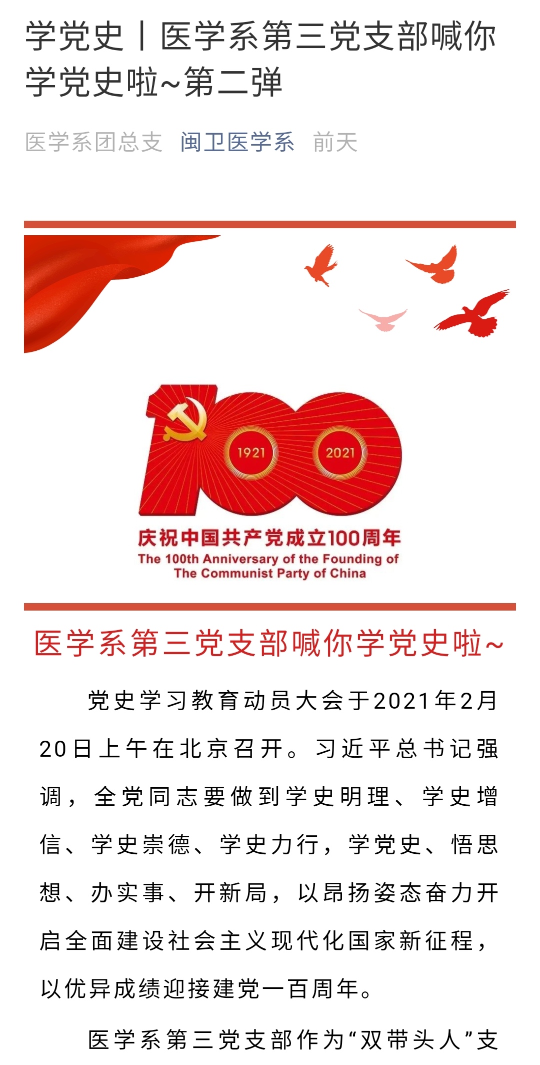醫(yī)學(xué)系第三黨支部作為“雙帶頭人”支部、省黨建工作樣板支部,積極組織全體黨員師生及入黨積極分子開展《中國共產(chǎn)黨簡史》有聲書錄制活動。大家通過黨史學(xué)習(xí)并錄音,進一步感悟初心使命,傳承紅色精神。目前,該有聲書活動已在醫(yī)學(xué)系團總支微信公眾號推出兩期,師生中反響熱烈,掀起黨史學(xué)習(xí)教育熱潮。