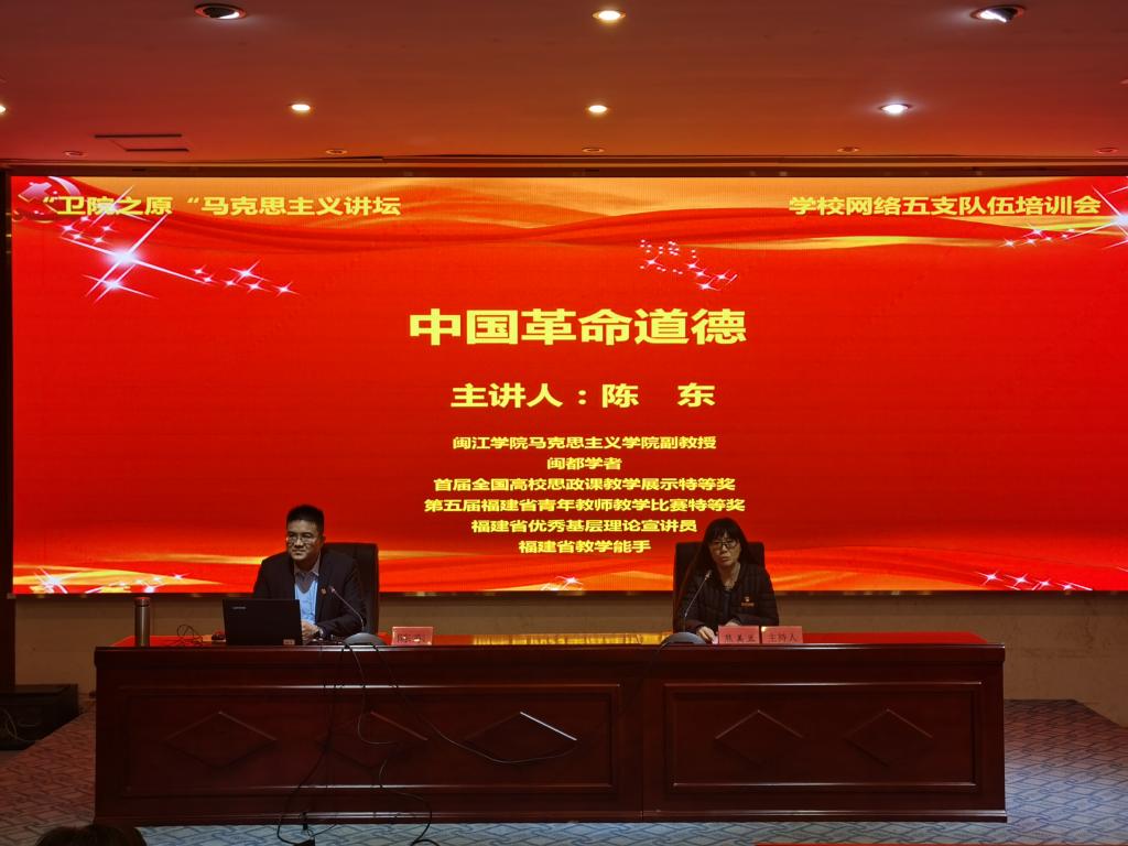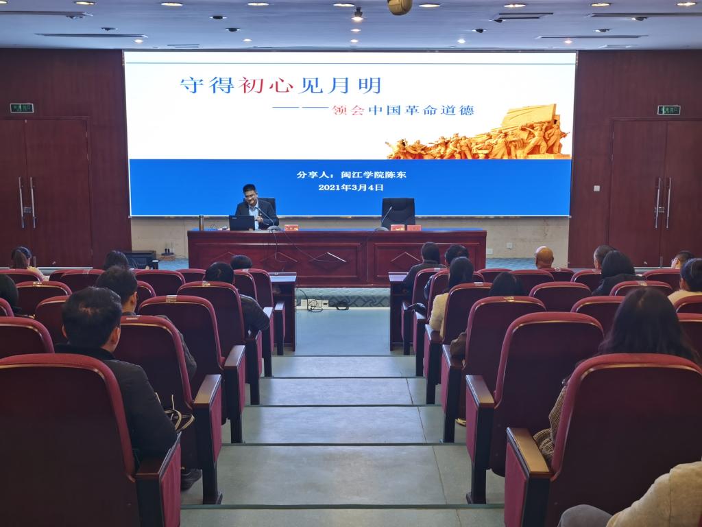 為深入學(xué)習(xí)習(xí)近平新時(shí)代中國特色社會(huì)主義思想,持續(xù)開展關(guān)于黨史、新中國史、改革開放史、社會(huì)主義發(fā)展史教育,深入學(xué)習(xí)中國革命精神,鞏固提升師生理想信念,2021年3月4日下午,閩江學(xué)院馬克思主義學(xué)院陳東副教授應(yīng)邀做題為“中國革命道德”專題講座。校黨委宣傳部、學(xué)生工作部、團(tuán)委等部門負(fù)責(zé)人、各二級(jí)院系黨總支書記及副書記、馬院全體專兼職教師和全體輔導(dǎo)員共同領(lǐng)會(huì)了中國革命道德的深刻內(nèi)涵。講座由馬克思主義學(xué)院院長熊美蘭主持。
