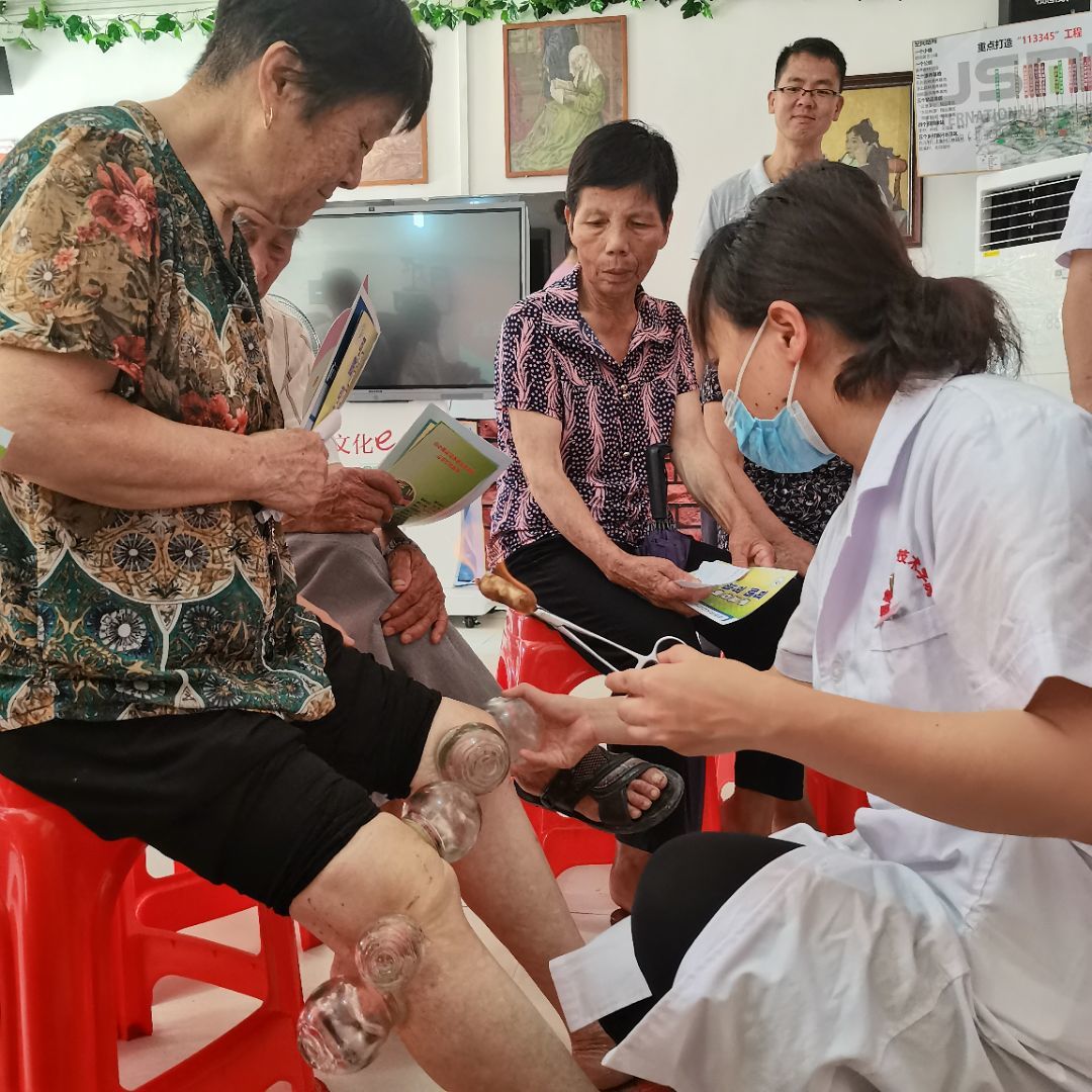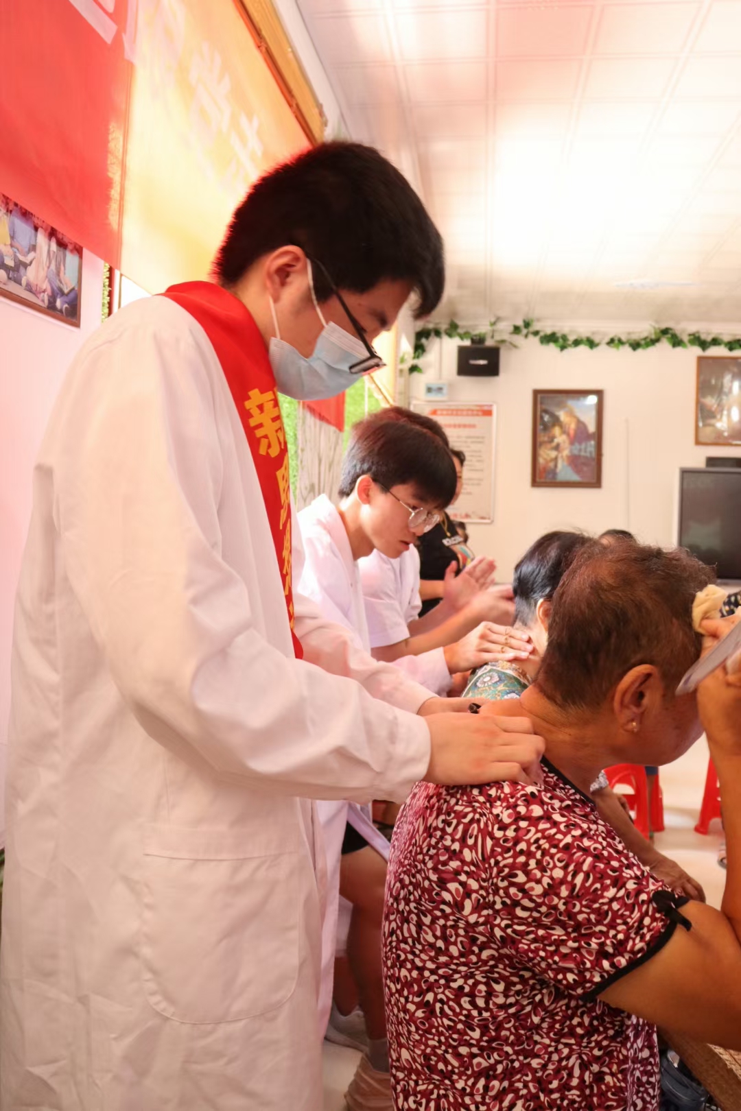 新時代的青年要在為人民服務(wù)中茁壯成長,要在社會實踐中增長工作本領(lǐng),要用行動證明新時代的中國青年是好樣的!本次“三下鄉(xiāng)”開展了送醫(yī)送藥活動,21位醫(yī)學(xué)生們各盡其能,發(fā)揮所長,為村民提供問診、推拿、拔罐、量血壓、測心率、健康咨詢等醫(yī)療服務(wù),進行心肺復(fù)蘇、海姆立克急救法和常見傷口繃帶包扎的現(xiàn)場演示講解,對預(yù)防高血壓、糖尿病等常見慢性疾病進行健康知識宣講,糾正村民健康保健常識誤區(qū),同時現(xiàn)場還為村民分發(fā)自制的防暑香囊,分發(fā)《衛(wèi)生條例手冊》等宣傳冊,進一步提高村民的健康意識、普及健康科學(xué)知識。義診活動特邀我校中醫(yī)康復(fù)技術(shù)專業(yè)負責人郭潔梅博士參與,她耐心問診,對“癥”分別施以推拿、刮痧、拔罐。雖然天氣酷熱,但村民聞訊紛紛前來,活動場面火爆。本次活動發(fā)揮專業(yè)優(yōu)勢,共為百余位村民提供診療,派發(fā)宣傳冊約200份,深受村民好評,同時也是我校黨史學(xué)習(xí)教育與服務(wù)群眾的生動結(jié)合,在實踐中錘煉了我校醫(yī)學(xué)生的能力與意志。