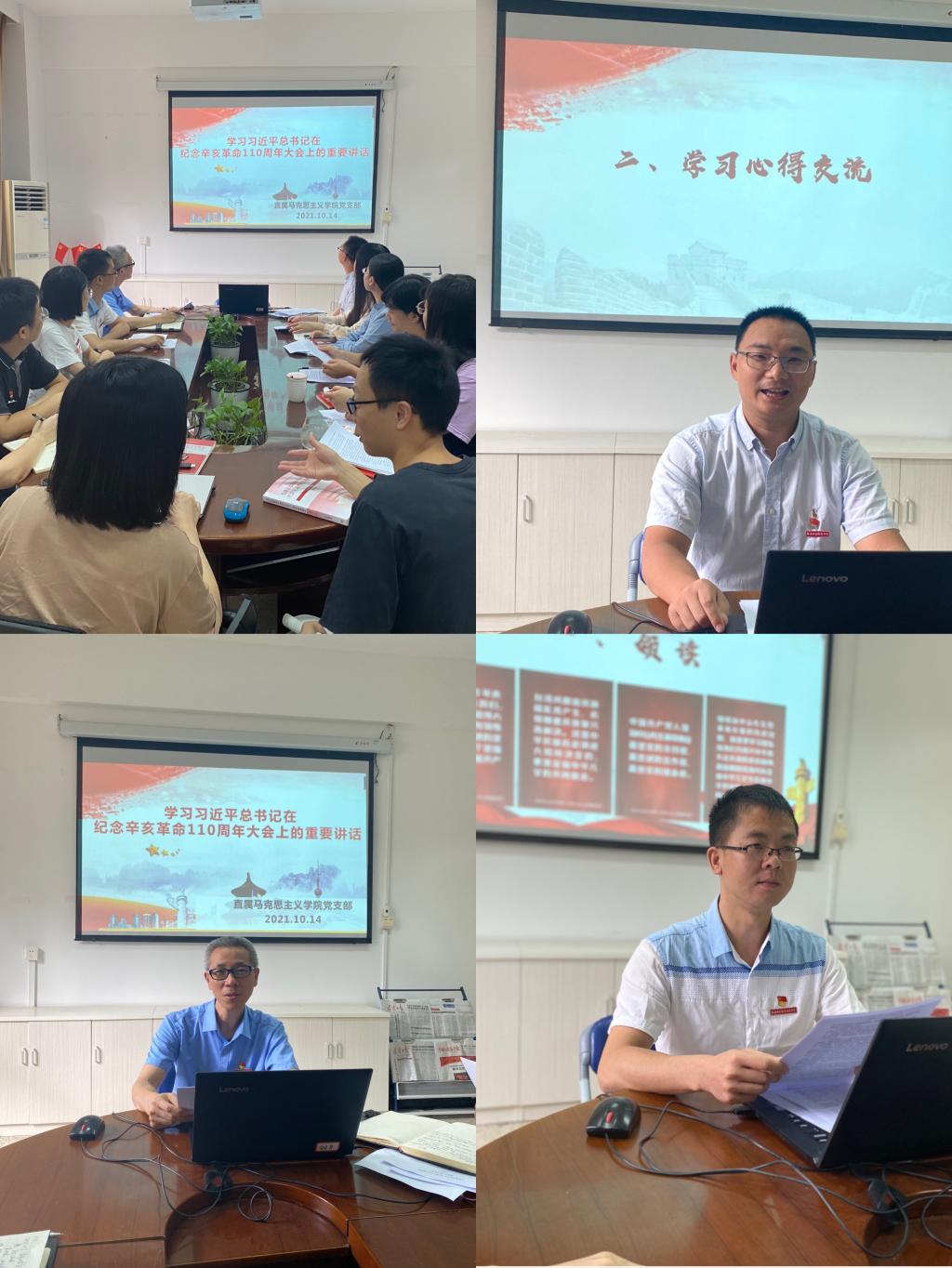 2021年10月14日,直屬馬克思主義學(xué)院黨支部在會議室107,集中學(xué)習(xí)《習(xí)近平在紀(jì)念辛亥革命110周年大會上的講話》,學(xué)習(xí)活動由黨支部宣傳委員羅蕓同志主持。