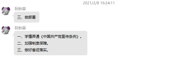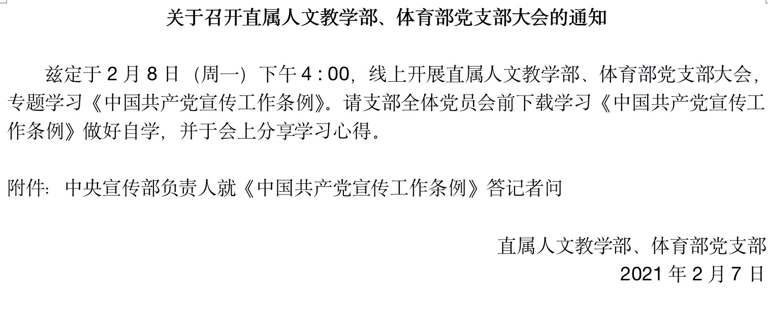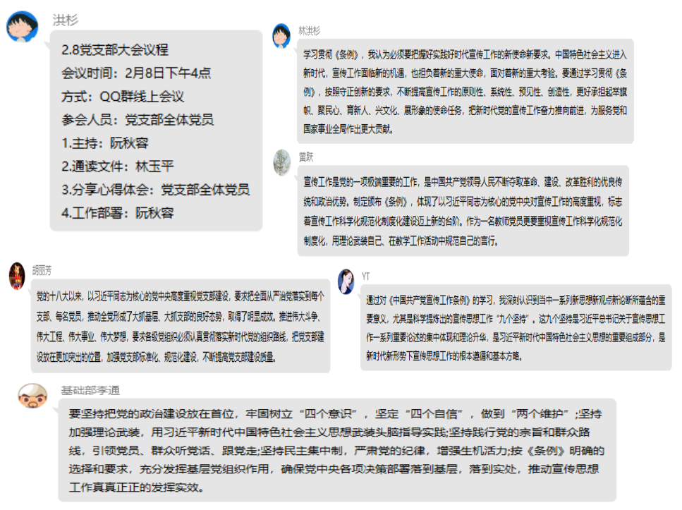 2月8日下午,直屬人文教學(xué)部和體育部黨支部在黨支部Q群召開線上黨員大會,專題組織學(xué)習(xí)《中國共產(chǎn)黨宣傳工作條例》(以下簡稱《條例》)和傳達(dá)全國宣傳部長會議精神,本次會議由直屬人文教學(xué)部和體育部黨支部阮秋容主持,支部全體黨員參加了會議。
