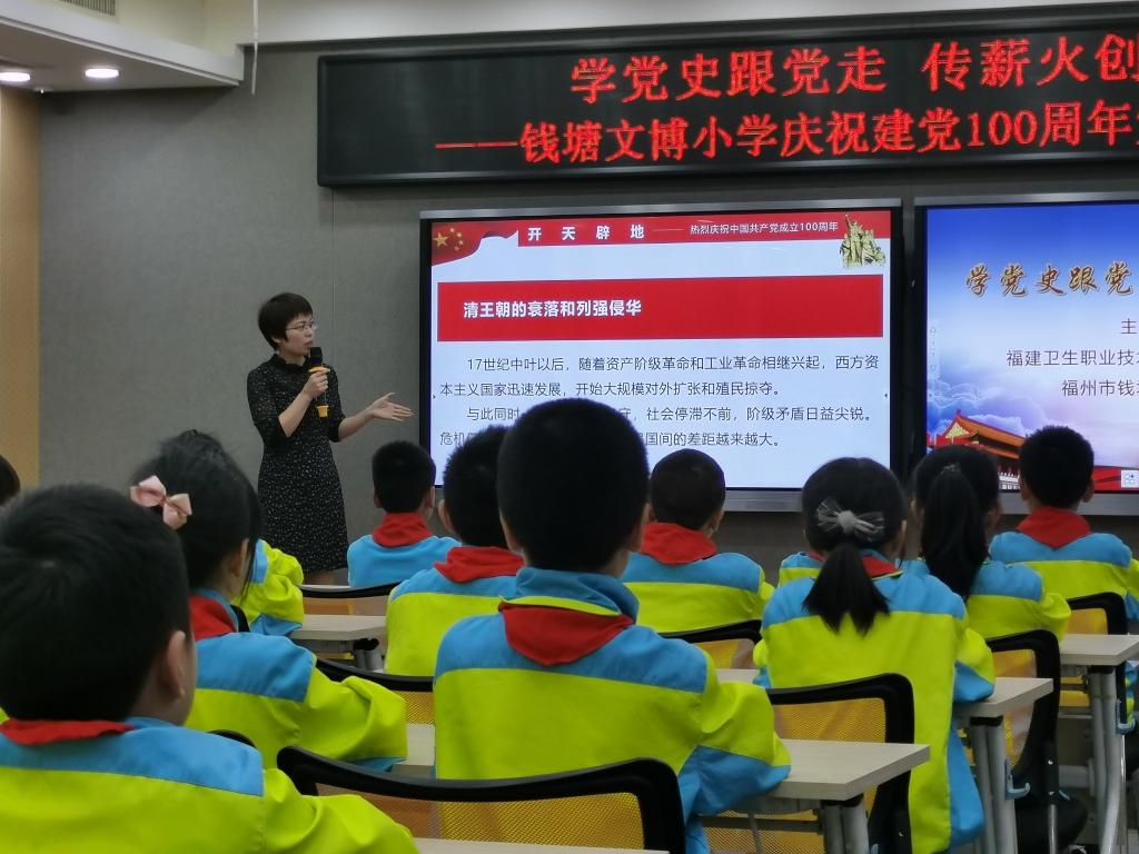 藥學(xué)院第二黨支部書記劉丹丹為錢塘文博小學(xué)的同學(xué)們介紹中國共產(chǎn)黨成立的歷史背景,總結(jié)了中國共產(chǎn)黨人領(lǐng)導(dǎo)中國人民推翻“三座大山”徹底改變中國面貌的豐功偉績,指出了中國共產(chǎn)黨帶領(lǐng)中國人民走出困境的歷史必然性。劉書記激情澎湃的演講點燃了同學(xué)們學(xué)習(xí)黨史的熱情。