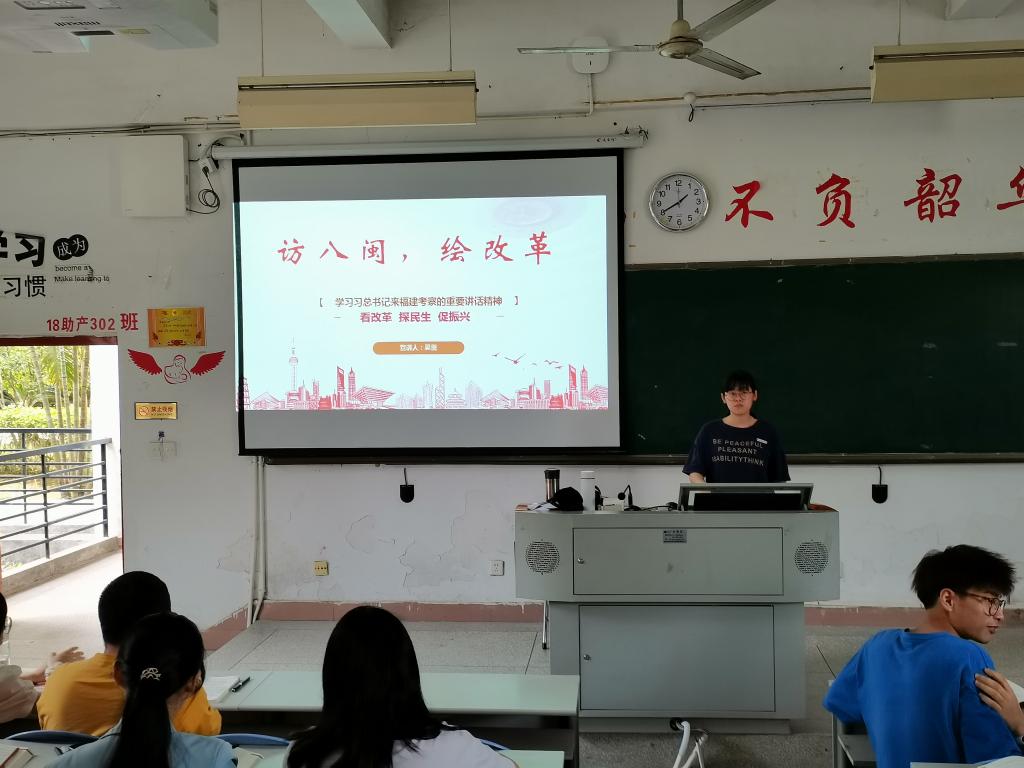 此次活動由吳蕾同學為同學們進行《訪八閩繪改革》的分享和交流。吳蕾從生態(tài)保護、衛(wèi)生健康、鄉(xiāng)村振興、城市建設(shè)、科技創(chuàng)新、改革深化、文化傳承、人才培養(yǎng)等方面,對習近平總書記在福建考察時的重要講話精神做了梳理和解讀。吳蕾講解通俗易懂,獲得同學們的陣陣掌聲。宣講結(jié)束后,胡濟林進行點評分析,鼓勵大家認真領(lǐng)會習近平總書記重要講話精神,學以致用,用實際行動去譜寫我校新篇章。