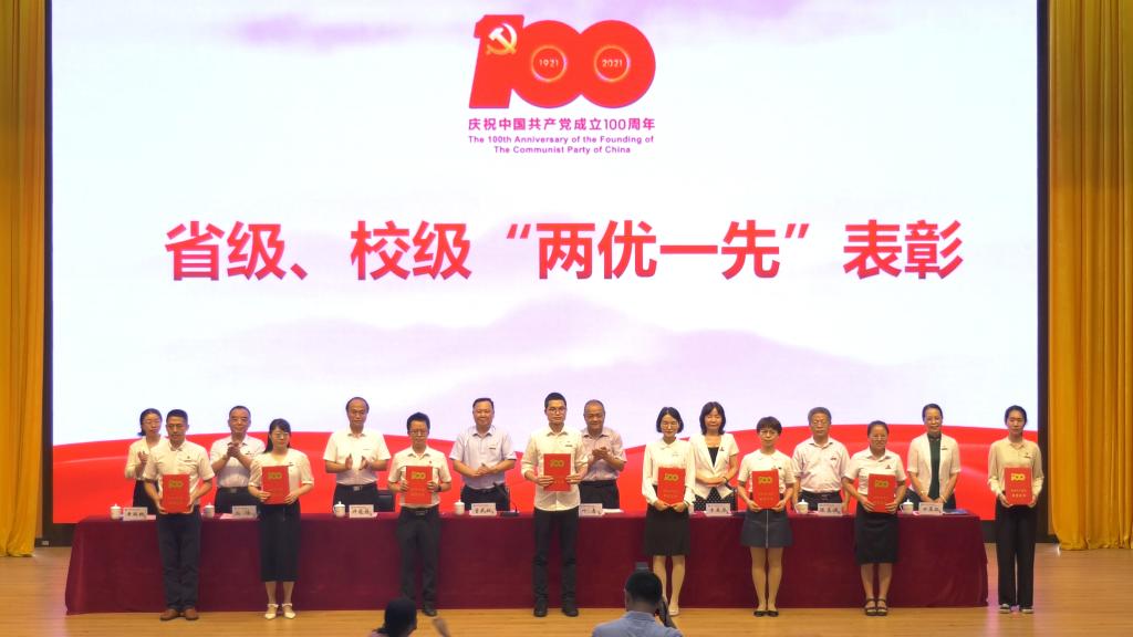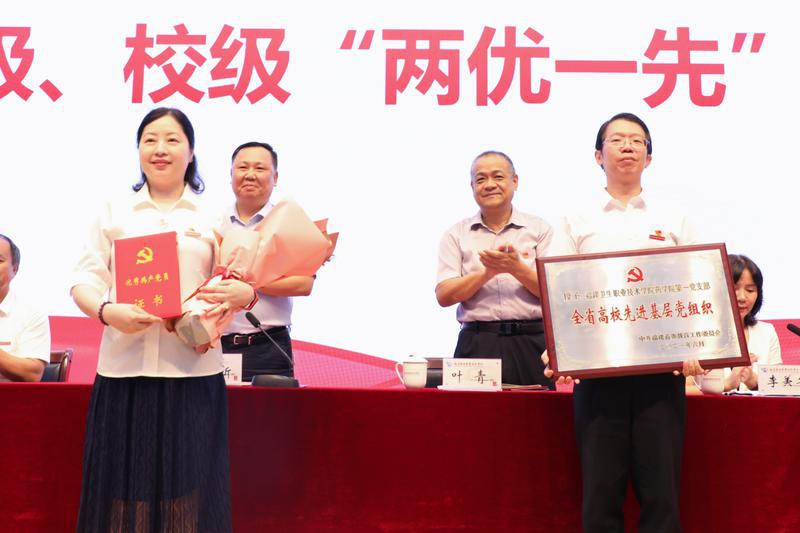 會(huì)議還進(jìn)行了省級(jí)、校級(jí)“兩優(yōu)一先”表彰。我校護(hù)理學(xué)院教授、“雙帶頭人”黨支部書(shū)記洪霞同志獲全省高?!皟?yōu)秀共產(chǎn)黨員”榮譽(yù)稱(chēng)號(hào),藥學(xué)院第一黨支部獲全省高?!跋冗M(jìn)基層黨組織”榮譽(yù)稱(chēng)號(hào)。同時(shí),還有6個(gè)黨組織和40位黨員同志獲得學(xué)校的“兩優(yōu)一先”表彰。在表彰儀式后,師生預(yù)備黨員代表進(jìn)行了入黨宣誓。在領(lǐng)誓人的帶領(lǐng)下,近100名師生預(yù)備黨員緊握右拳,面對(duì)鮮紅黨旗,發(fā)出莊嚴(yán)宣誓。錚錚誓言,鏗鏘有力,表達(dá)了新黨員們堅(jiān)定的理想信念、價(jià)值追求和為共產(chǎn)主義事業(yè)奮斗終生的決心。
