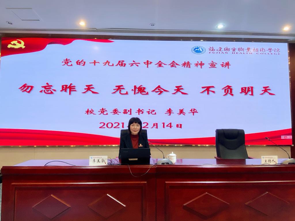 為深入學(xué)習(xí)宣傳貫徹黨的十九屆六中全會(huì)精神,12月14日,校黨委副書記李美華為聯(lián)系班級(jí)學(xué)生和護(hù)理學(xué)院黨員教師共145人宣講黨的十九屆六中全會(huì)精神。