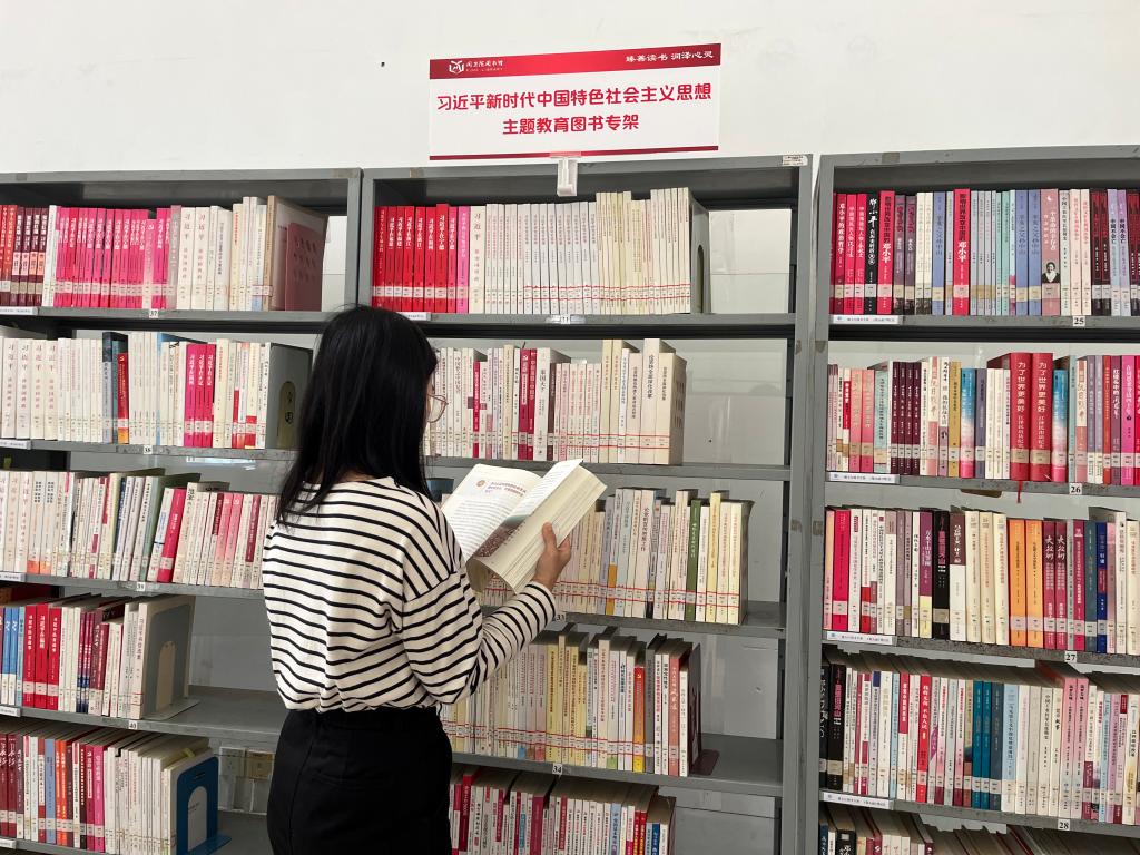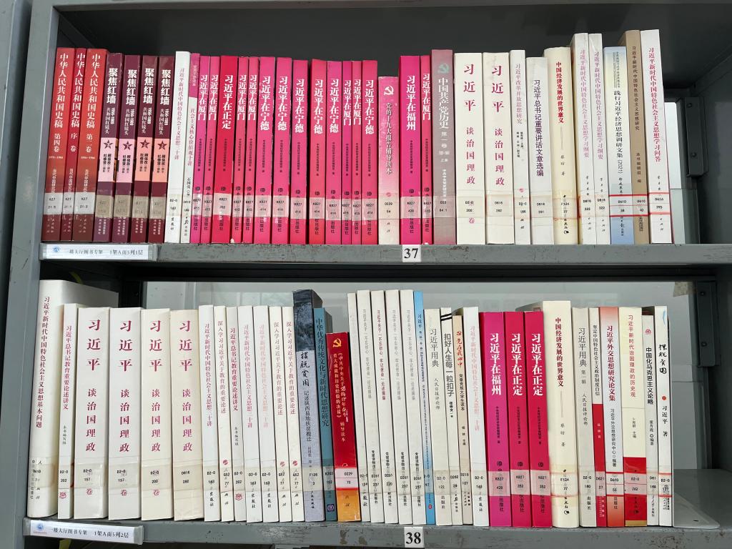 專架陳列了《習(xí)近平著作選讀》(第一卷、第二卷)、《習(xí)近平關(guān)于調(diào)查研究論述摘編》《習(xí)近平新時代中國特色社會主義思想專題摘編》《習(xí)近平新時代中國特色社會主義思想學(xué)習(xí)綱要(2023年版)》等主題教育重要學(xué)習(xí)材料,以及習(xí)近平新時代中國特色社會主義思想其他相關(guān)圖書,包括習(xí)近平總書記著作、論述摘編、學(xué)習(xí)讀本、工作足跡、思想研究、系列重要講話、語言典故等共計500余冊,可供廣大師生前往借閱。