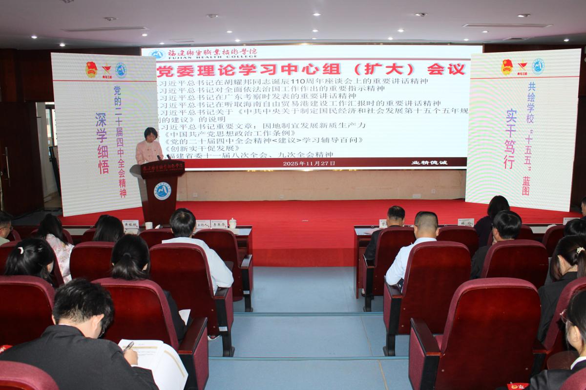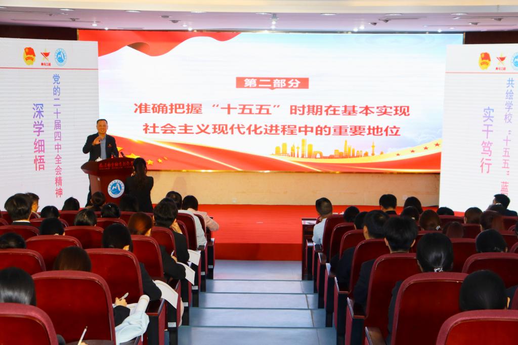 宣講開篇,曾武祈從歷史維度、戰(zhàn)略維度、實踐維度,系統(tǒng)闡述了黨的二十屆四中全會的重大意義。他強調(diào),2025年作為“十四五”收官與“十五五”謀劃的關(guān)鍵節(jié)點,此次全會審議通過的綱領(lǐng)性文件,為學(xué)校在基本實現(xiàn)社會主義現(xiàn)代化進程中找準定位、主動作為提供了根本遵循。在宣講主體部分,曾武祈聚焦全會精神核心要義,緊扣教育強國、教育強省建設(shè)使命任務(wù)展開針對性解讀,深入闡釋“十五五”時期經(jīng)濟社會發(fā)展的指導(dǎo)思想、核心原則與重點部署。立足學(xué)校發(fā)展實際,曾武祈將全會精神與學(xué)校第三次黨代會精神深度融合,圍繞全會提出的“加快高水平科技自立自強”“統(tǒng)籌教育強國建設(shè)”“強化現(xiàn)代化建設(shè)人才支撐”等重要論述,精準剖析學(xué)校在職教底色、健康本色、服務(wù)特色等方面的優(yōu)勢和職責使命,明確學(xué)校未來五至十年特別是“十五五”時期的發(fā)展思路和重點任務(wù)。
