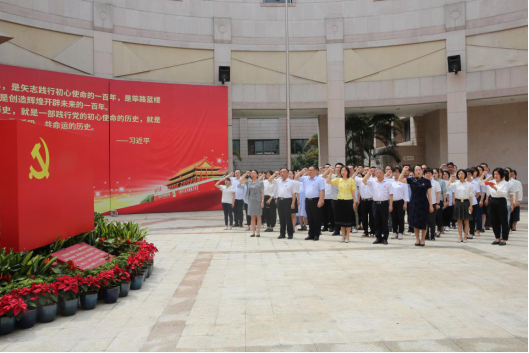 “奮斗百年路 啟航新征程。”在圓形廣場(chǎng),院直機(jī)關(guān)黨總支組織黨員干部重溫入黨誓詞,面向鮮紅的黨旗莊嚴(yán)宣誓。