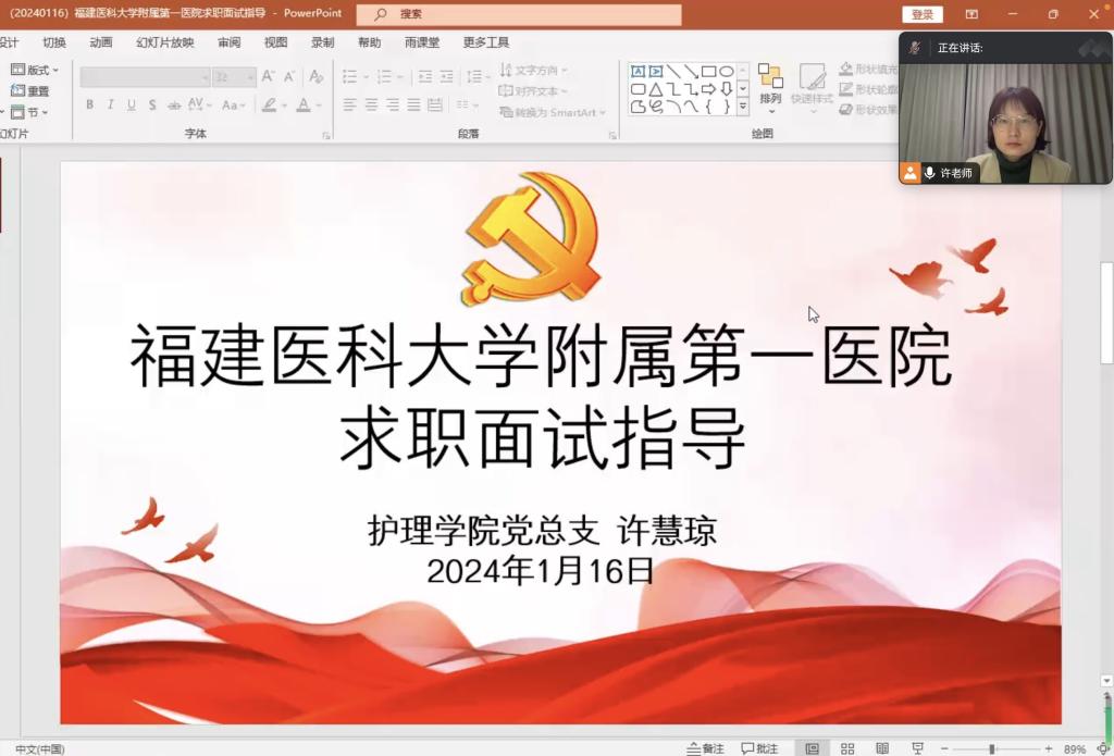 為進(jìn)一步加強(qiáng)畢業(yè)生就業(yè)指導(dǎo)與服務(wù)工作,提升就業(yè)競(jìng)爭(zhēng)力,認(rèn)真落實(shí)“我為學(xué)生辦實(shí)事”,1月16日晚,護(hù)理學(xué)院學(xué)生第一黨支部通過(guò)騰訊會(huì)議開(kāi)展福建醫(yī)科大學(xué)附屬第一醫(yī)院求職面試指導(dǎo)講座,著力解決學(xué)生最關(guān)心、最直接、最現(xiàn)實(shí)的問(wèn)題。本次培訓(xùn)由黨總支專職組織員許慧瓊主講,130多位同學(xué)線上聆聽(tīng)。
