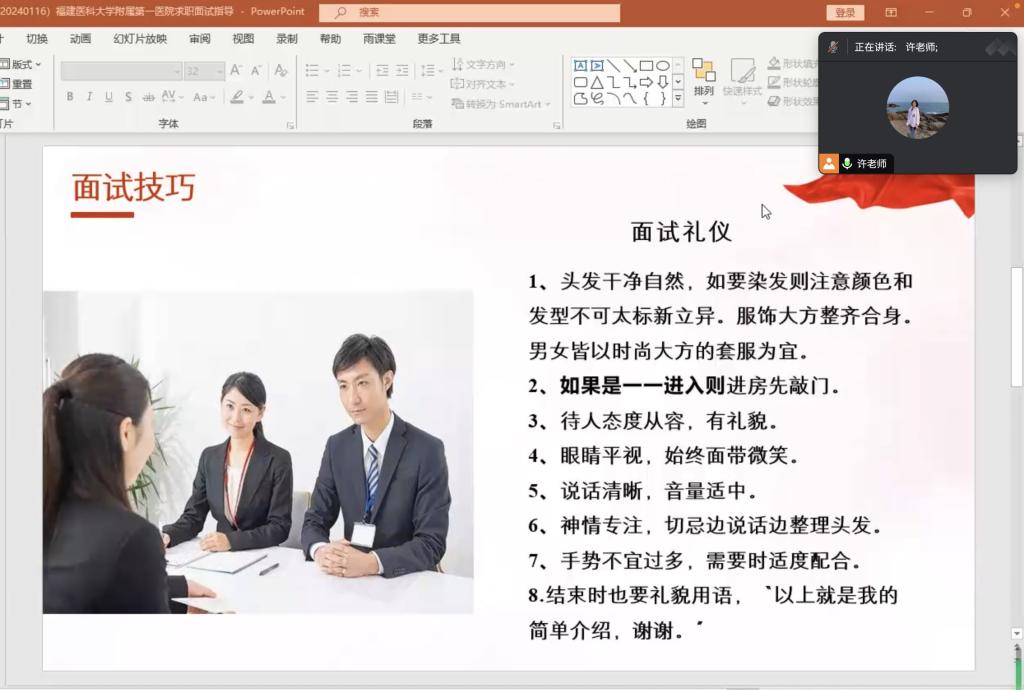 許慧瓊結(jié)合多年就業(yè)指導(dǎo)經(jīng)驗(yàn),從面試禮儀和面試自我介紹兩方面詳細(xì)為進(jìn)入福建醫(yī)科大學(xué)附屬第一醫(yī)院招聘考試面試環(huán)節(jié)同學(xué)深入講解面試技巧。