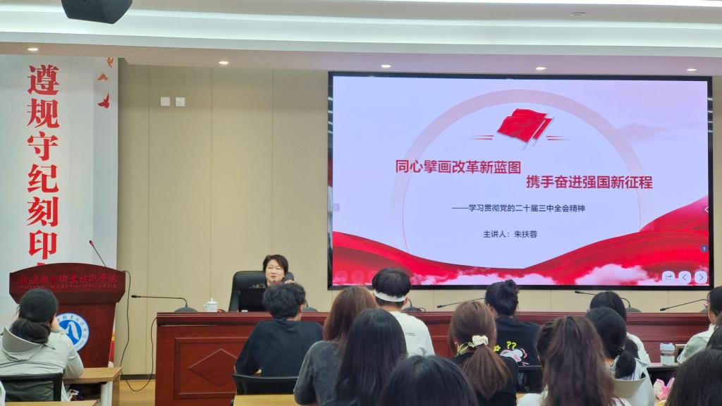 9月13日下午,校黨委委員朱扶蓉以“同心擘畫改革新藍(lán)圖 攜手奮進(jìn)強(qiáng)國(guó)新征程”為題,走進(jìn)24護(hù)理307、308班為我校師生專題宣講黨的二十屆三中全會(huì)精神暨秋季開學(xué)第一課。