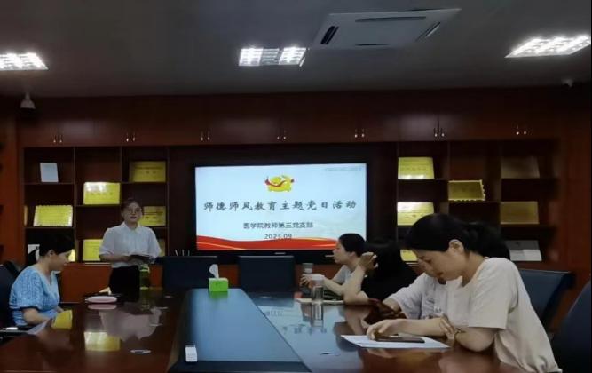 為提升支部黨員教師思想政治素質(zhì),全面加強(qiáng)師德師風(fēng)建設(shè),2023年9月21日,醫(yī)學(xué)院教師第三黨支部開(kāi)展“師德師風(fēng)教育”主題黨日活動(dòng)?;顒?dòng)由支部書(shū)記陳銘主持。