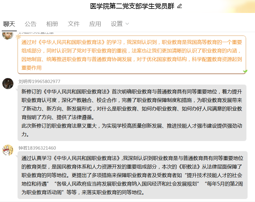 學(xué)習(xí)活動(dòng)由支部書記高長花主持,她指出,職業(yè)教育是國民教育體系和人力資源開發(fā)的重要組成部分,是培養(yǎng)多樣化人才、傳承技術(shù)技能、促進(jìn)就業(yè)創(chuàng)業(yè)的重要途徑。此次《中華人民共和國職業(yè)教育法》的修訂,深入貫徹了習(xí)近平總書記重要指示批示精神和黨中央、國務(wù)院關(guān)于職業(yè)教育改革發(fā)展的決策部署,系統(tǒng)總結(jié)了職業(yè)教育改革發(fā)展的政策舉措和實(shí)踐成果,進(jìn)一步完善了新時(shí)代職業(yè)教育法律制度體系。貫徹實(shí)施新修訂的《中華人民共和國職業(yè)教育法》,對于推動(dòng)職業(yè)教育高質(zhì)量發(fā)展,建設(shè)教育強(qiáng)國、人力資源強(qiáng)國和技能型社會(huì),推進(jìn)社會(huì)主義現(xiàn)代化建設(shè)具有重要意義。