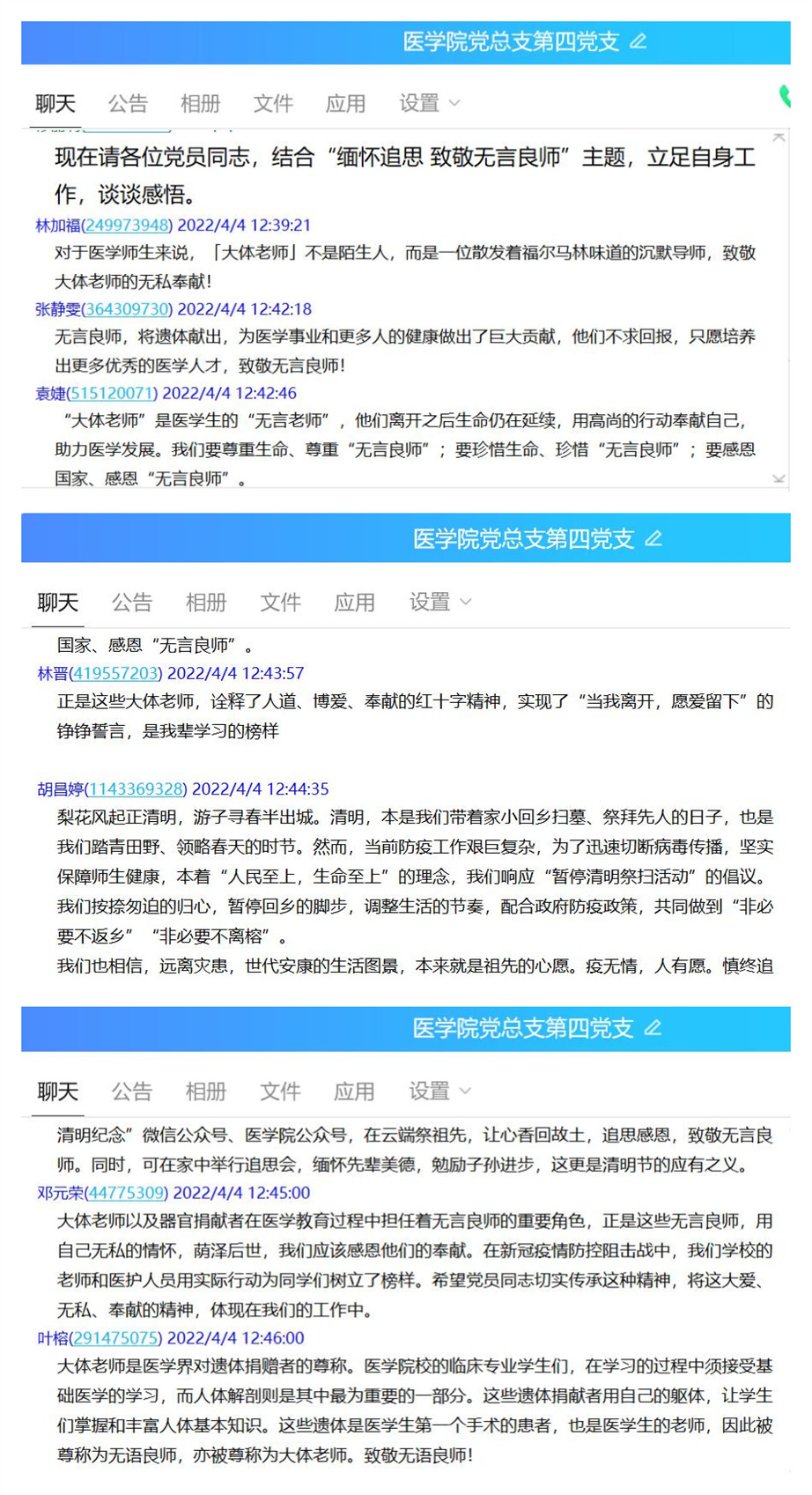 本次“線上緬懷追思 致敬無言良師”活動也是支部開展“科普益民,健康相伴”之“敬畏生命,感恩成長”活動的一部分。黨員同志除了自身的學習感悟,還應將其與“課程思政”建設相結合,在各自的課程授課中,教育新時代的青年從無言良師精神、英雄先烈精神、抗疫英雄精神中汲取砥礪前行的動力,用奮斗為祖國貢獻青春力量!