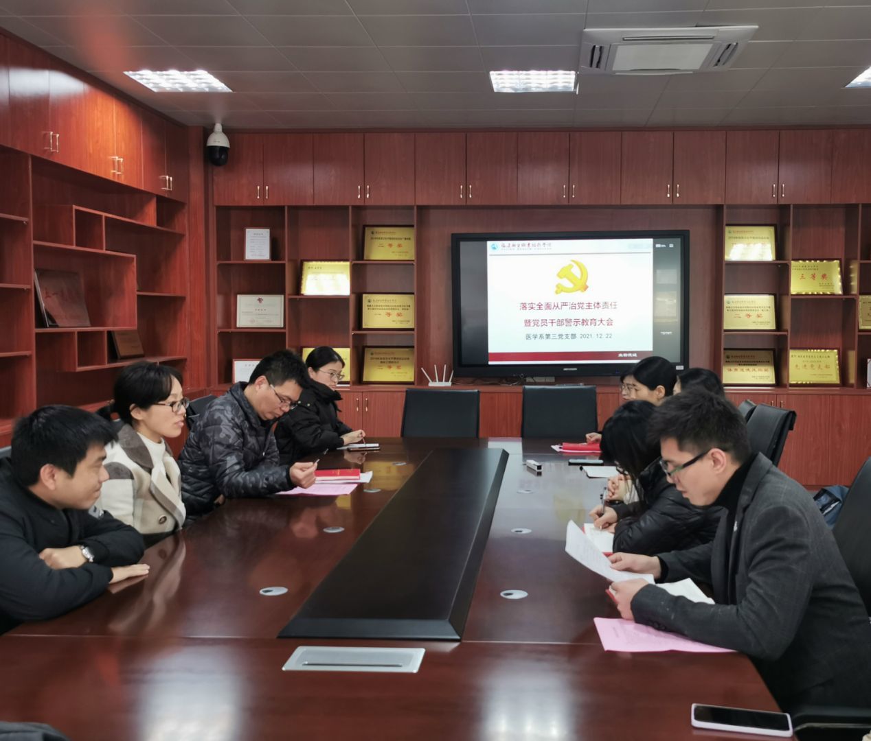 為認(rèn)真學(xué)習(xí)貫徹落實(shí)全面從嚴(yán)治黨主體責(zé)任,增強(qiáng)黨員干部的責(zé)任意識(shí)、服務(wù)意識(shí)廉潔自律意識(shí)和拒腐防變能力,2021年12月22日中午,醫(yī)學(xué)系第三黨支部在實(shí)訓(xùn)樓311開展“落實(shí)全面從嚴(yán)治黨主體責(zé)任暨黨員干部警示教育”主題黨日活動(dòng),此次主題黨日活動(dòng)由支部書記陳銘主持。