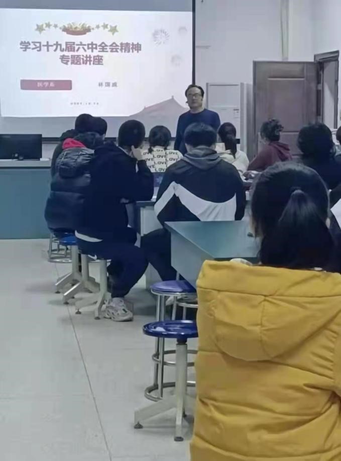 12月12日晚,醫(yī)學(xué)系副主任林國威在醫(yī)學(xué)基礎(chǔ)部404為21口腔303班的學(xué)生宣講黨的十九屆六中全會精神。