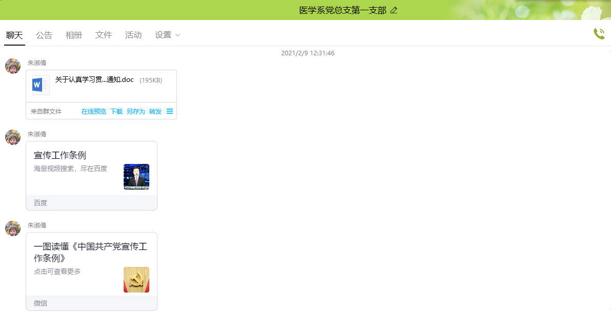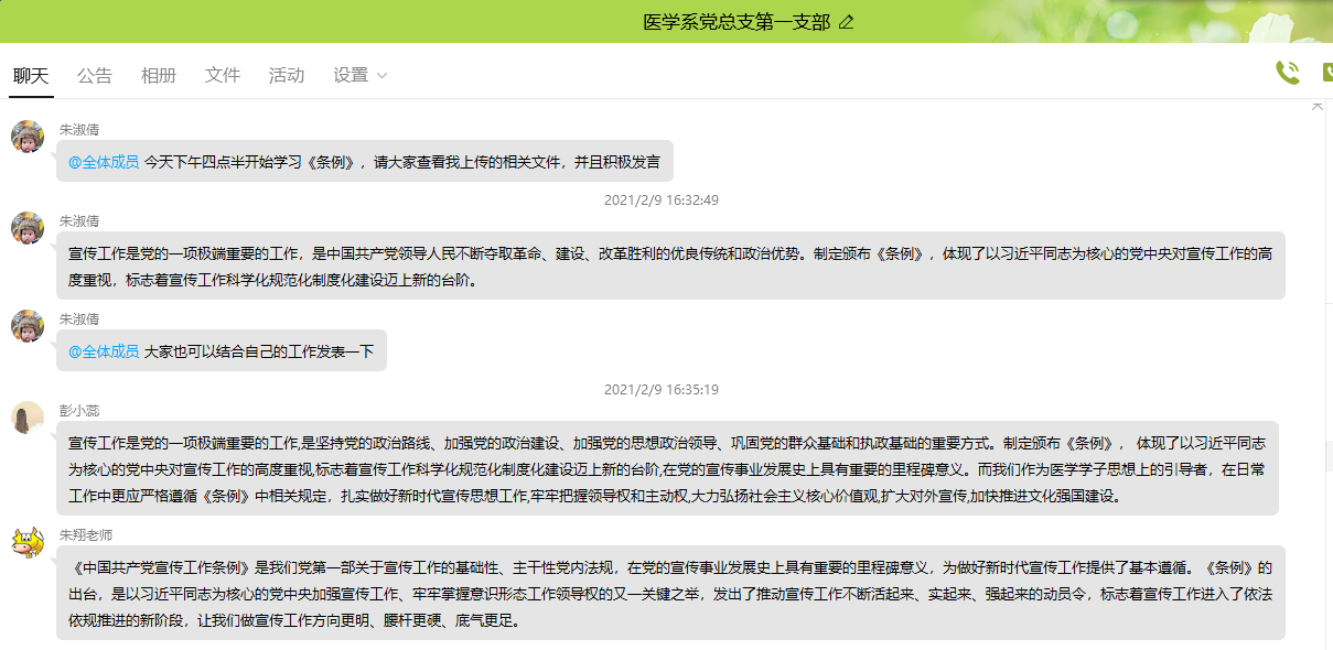 為提高全體黨員的政治意識和宣傳工作水平,2月9日下午,醫(yī)學(xué)系第一黨支部組織全體黨員開展線上學(xué)習(xí)《中國共產(chǎn)黨宣傳工作條例》(以下簡稱《條例》)主題黨日活動,由支部書記朱翔同志主持。