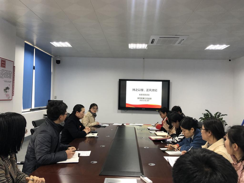 為進一步增強支部黨員的紀律意識,提升黨性修養(yǎng),2021年1月7日中午,醫(yī)學系第三黨支部在實訓樓311會議室開展“持之以恒,正風肅紀”主題黨日活動。活動由支部書記陳銘同志主持。