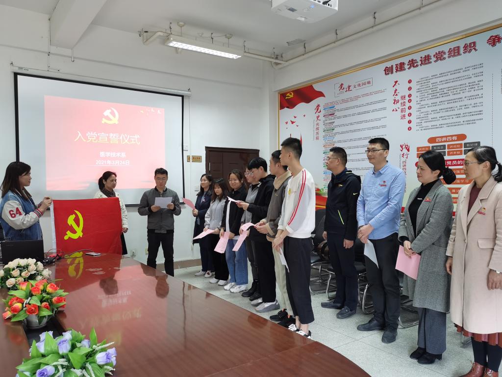 2021年3月24日,醫(yī)學技術系黨總支于系部會議室301舉行新黨員入黨宣誓儀式。系黨總支書記陳俊穎、副書記林燕、黨總支委員及黨支部書記、新黨員參加了儀式。儀式由學生黨支部書記曾慶才同志主持。
