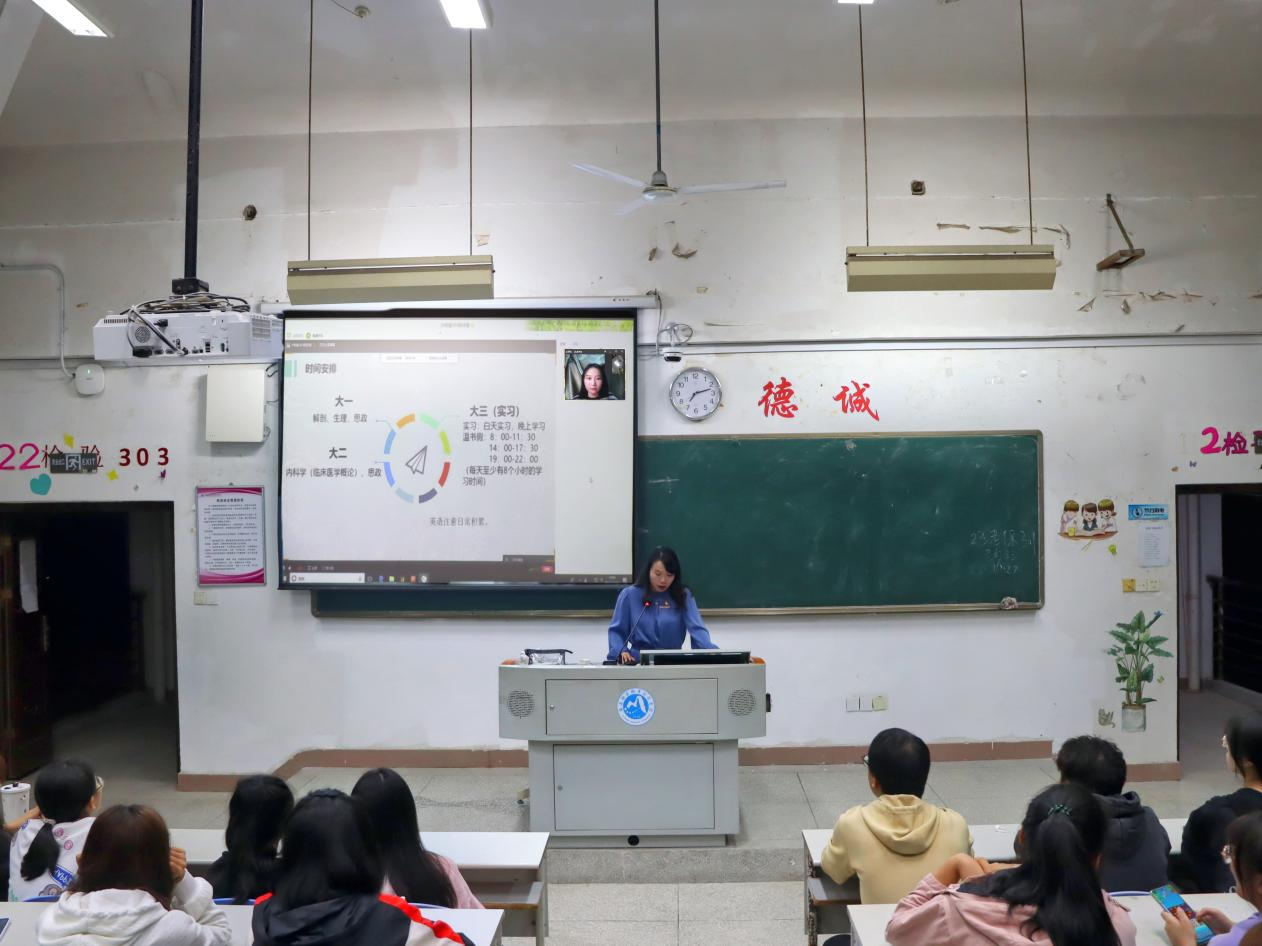 陳詩麥考上了莆田學(xué)院的檢驗(yàn)專業(yè),她通過網(wǎng)絡(luò)連麥的方式從時間安排、科目安排及心態(tài)調(diào)適三個方面給在場的學(xué)弟學(xué)妹們進(jìn)行分享。在時間安排上,她建議學(xué)弟學(xué)妹們戰(zhàn)線不要拉太長,不能因?yàn)閷I緺奚粼谛5拿篮脮r光。大一時要認(rèn)真上好解剖、生理、思政三門課程,英語基礎(chǔ)差的同學(xué)則要持之以恒地進(jìn)行英語知識的積累;大二對于臨床醫(yī)學(xué)概論和思政這兩門課要多花心思;大三實(shí)習(xí)階段,白天實(shí)習(xí),晚上一定要騰出時間復(fù)習(xí),在最后的溫書假沖刺階段,每天至少要保證八個小時的學(xué)習(xí)時間。在復(fù)習(xí)時間安排上,她建議按照考試安排的科目順序,進(jìn)行上午和下午的復(fù)習(xí),例如大學(xué)英語是在上午考,那么英語的復(fù)習(xí)安排盡量都在上午進(jìn)行,給大腦養(yǎng)成一種思維習(xí)慣。