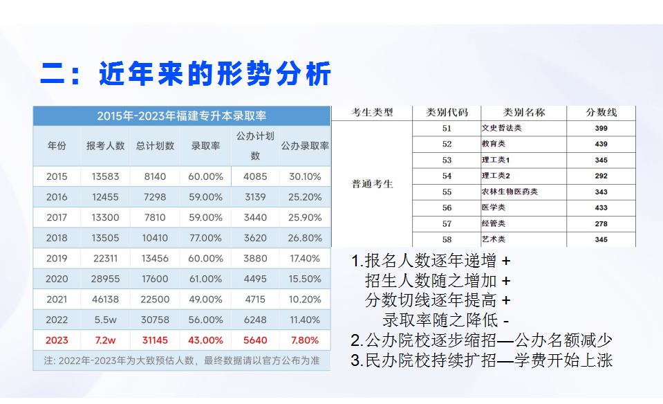 二是近年來的專升本形勢分析,他結(jié)合2015-2023年專升本的報考人數(shù)、錄取率、公辦錄取率以及各個專業(yè)大類的錄取分?jǐn)?shù)線進(jìn)行分析,專升本的競爭也越來越激烈。