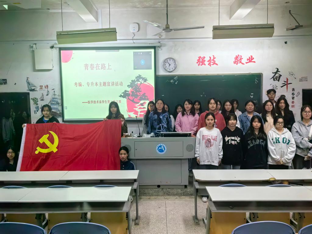 為進(jìn)一步促進(jìn)優(yōu)良學(xué)風(fēng),營(yíng)造良好的學(xué)習(xí)氛圍。幫助同學(xué)們加深對(duì)就業(yè)前景的認(rèn)識(shí),充分交流專升本考試的經(jīng)驗(yàn),以便學(xué)生們做好未來的學(xué)習(xí)規(guī)劃和掌握備考技巧。2023年11月12日晚,醫(yī)學(xué)技術(shù)系學(xué)生第二黨支部在醫(yī)學(xué)技術(shù)系第一階梯教室舉辦了青春在路上——醫(yī)學(xué)技術(shù)系學(xué)生第二黨支部考編、專升本宣講會(huì)。為方便在校生與實(shí)習(xí)生參與宣講會(huì),會(huì)議通過線上線下結(jié)合形式開展,邀請(qǐng)優(yōu)秀畢業(yè)生代表石錦淮、張烽、王遠(yuǎn)宏與同學(xué)們分享學(xué)習(xí)備考的經(jīng)驗(yàn)。