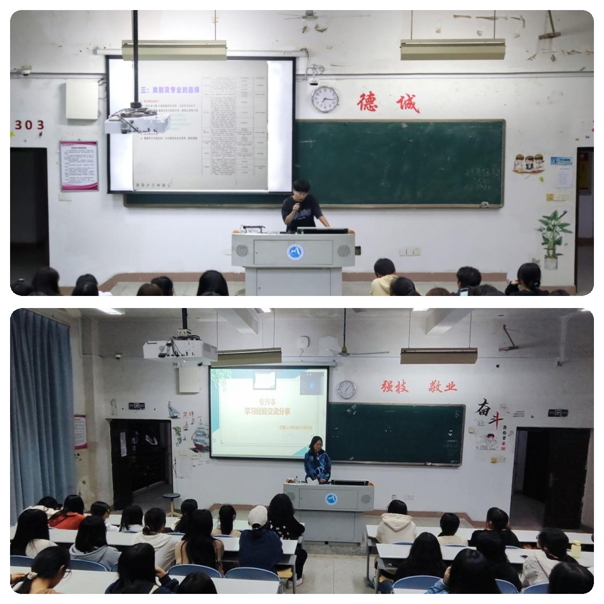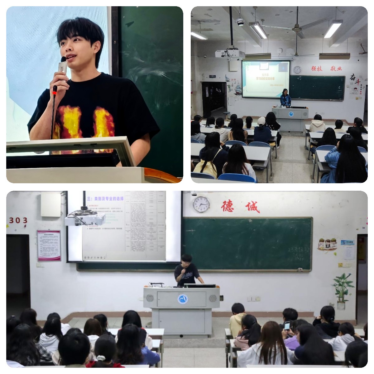 隨著學(xué)生個(gè)性化發(fā)展和未來規(guī)劃的不同,跨專業(yè)學(xué)歷深造成為一種選擇。2023屆畢業(yè)生余建雄和沈立濤回到母校分享跨專業(yè)專升本經(jīng)驗(yàn),2023屆畢業(yè)生王遠(yuǎn)宏通過在線方式開展交流。他們從招生政策解讀、專業(yè)學(xué)校選擇、歷年錄取情況、報(bào)考條件、考試科目、考試方式等方面詳細(xì)分享備考經(jīng)驗(yàn)。三位畢業(yè)生還就如何過好大學(xué)生活進(jìn)行分析,深入談了跨考的利與弊,引導(dǎo)學(xué)弟學(xué)妹們要將眼光放長(zhǎng)遠(yuǎn),在全面分析個(gè)人興趣及學(xué)習(xí)基礎(chǔ)上,再?zèng)Q定發(fā)展方向。