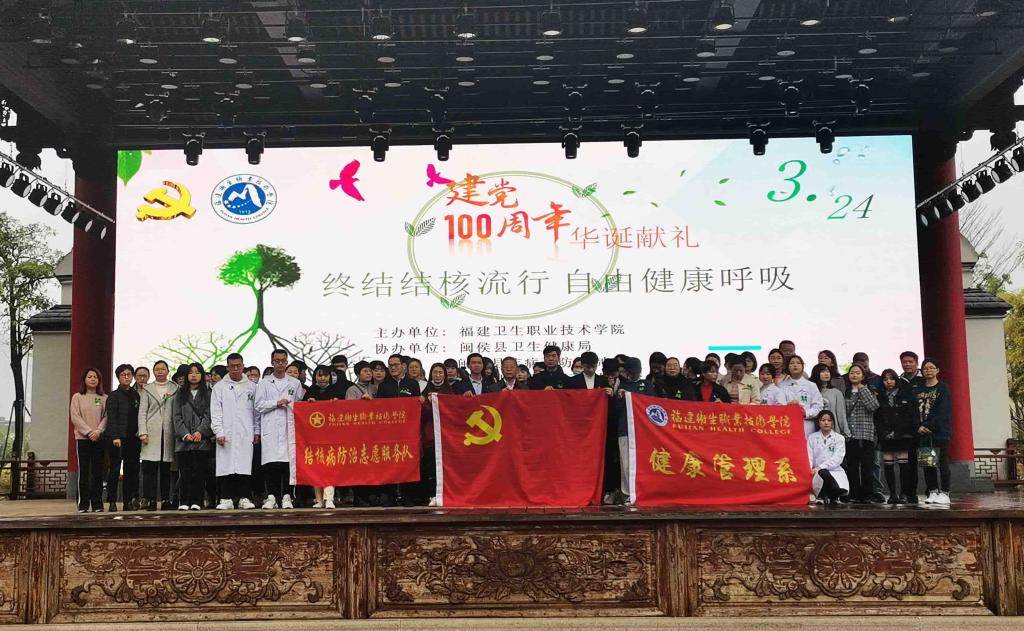 3月21日,第26個(gè)“世界防治結(jié)核病日”來(lái)臨之際,福建衛(wèi)職院聯(lián)合福建省疾控中心、閩侯縣衛(wèi)生局、閩侯縣文旅局、閩侯縣疾控中心、閩都民俗園管理服務(wù)中心等單位在閩都民俗園舉辦以“終結(jié)結(jié)核流行 自由健康呼吸”為主題的結(jié)核病防治健康宣教黨日活動(dòng),以實(shí)際行動(dòng)獻(xiàn)禮建黨100周年華誕。健康管理系師生黨員、學(xué)生志愿者和各協(xié)辦單位領(lǐng)導(dǎo)來(lái)賓參加活動(dòng)?;顒?dòng)由健康管理系黨總支第一支部承辦,副校長(zhǎng)陳貞健以普通黨員身份參加活動(dòng)。