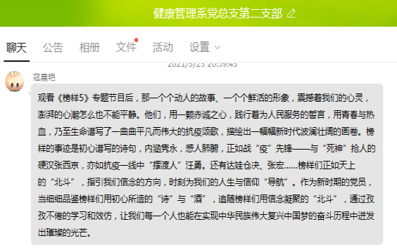 通過榜樣5的學(xué)習(xí),黨員們紛紛表示:以先進典型為榜樣,從偉大抗疫精神中汲取奮進力量,為全面建設(shè)社會主義現(xiàn)代化國家、實現(xiàn)中華民族偉大復(fù)興的中國夢作出新的更大貢獻。