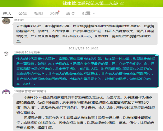 為宣傳偉大抗疫精神,集中展現(xiàn)新冠肺炎疫情防控阻擊戰(zhàn)中先進基層黨組織和優(yōu)秀共產(chǎn)黨員風(fēng)采,深化拓展“不忘初心、牢記使命”主題教育成果,擴大全國優(yōu)秀共產(chǎn)黨員和先進基層黨組織評選表彰成效,營造團結(jié)鼓勁、弘揚正氣的濃厚氛圍,3月23日,健康管理系黨總支第二支部組織全體師生黨員在線收看《榜樣5》。