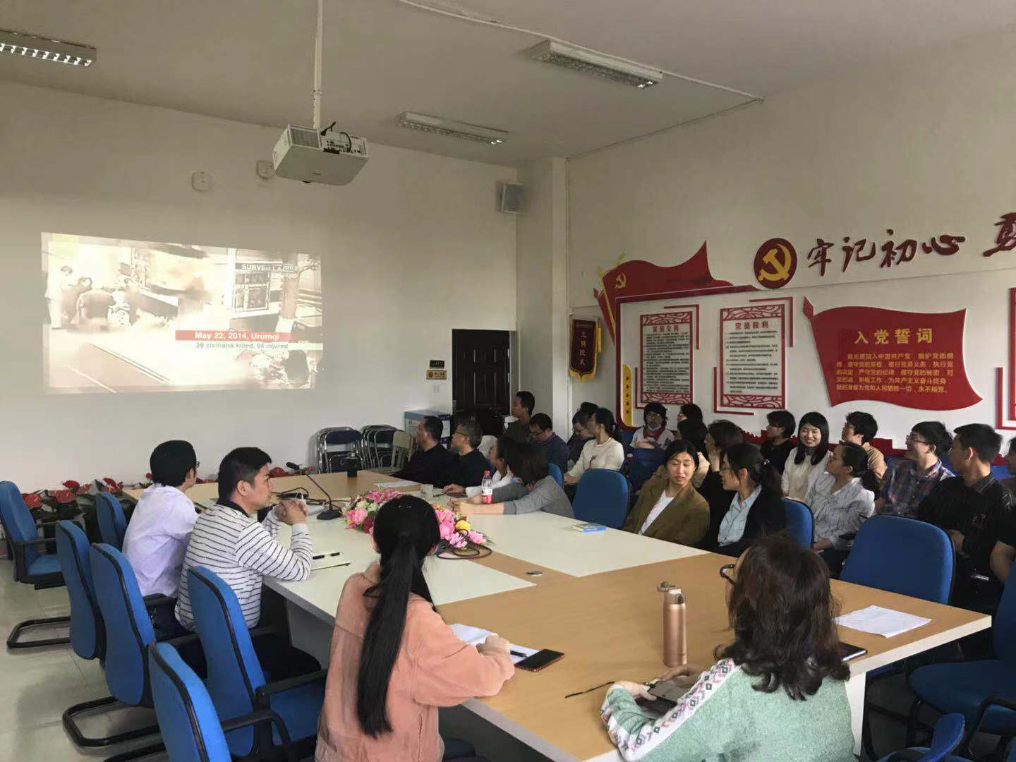 學習會上組織教師一起觀看意識形態(tài)專題紀錄片《暗流涌動——中國新疆反恐挑戰(zhàn)》。