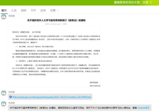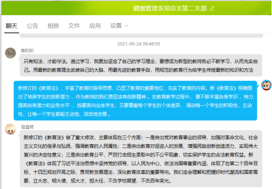 9月24日,健康管理系黨總支第二支部組織全體師生黨員開展專題學(xué)習(xí)交流會(huì),學(xué)習(xí)新修訂的《中華人民共和國教育法》。會(huì)議由支部書記張凱捷主持。