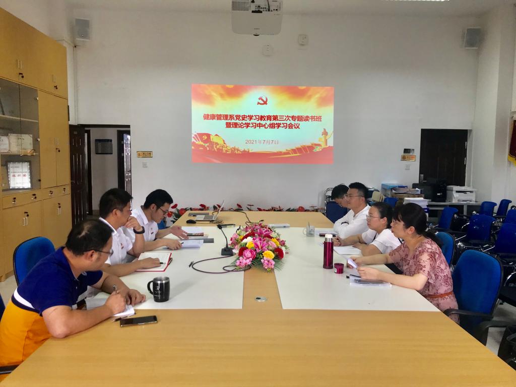 2021年7月7日,健康管理系黨史學(xué)習(xí)教育讀書班第三次學(xué)習(xí)暨中心組學(xué)習(xí)會在會議室505召開專題學(xué)習(xí),本次學(xué)習(xí)會議由健康管理系黨總支書記黃曦主持。