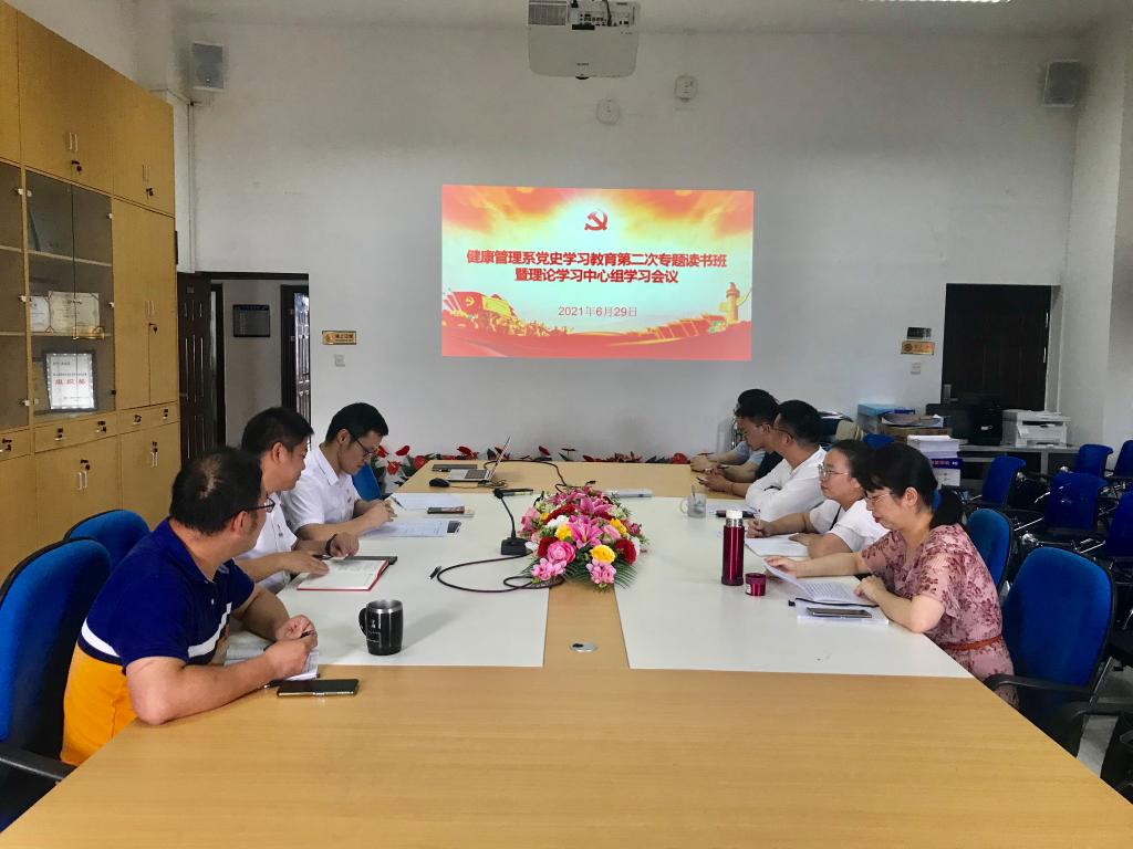 2021年6月29日,健康管理系黨史學習教育讀書班第二次學習暨中心組學習會在會議室505召開專題學習,本次學習會議由健康管理系黨總支書記黃曦主持。