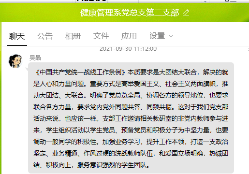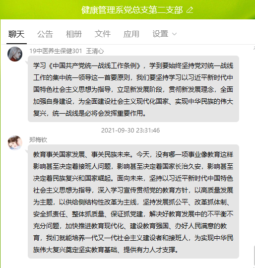 9月30日,健康管理系黨總支第二支部組織全體師生黨員開展專題學(xué)習(xí)交流會,學(xué)習(xí)《關(guān)于深入學(xué)習(xí)宣傳貫徹黨的教育方針的通知》精神、《中國共產(chǎn)黨統(tǒng)一戰(zhàn)線工作條例》及《中共福建省委關(guān)于貫徹<中國共產(chǎn)黨統(tǒng)一戰(zhàn)線工作條例>的實(shí)施意見》。會議由支部書記張凱捷主持。