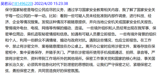 學習后,教師黨員吳若云同志表示,保守國家秘密是每位公民應盡的義務,在日常生活和工作中,如果遇到可疑事件或可疑人物,如:看到一些可疑人員未經批準到內部作調查,進行科技、經濟、企業(yè)等情況搜集,應當向當地公安機關或國家安全機關報告。保密工作事關黨和國家的核心利益,事關國家長治久安,必須筑牢信息化時代下防泄密的思想防線,讓我們嚴守保密之紀,緊繃保密之弦,勇?lián)C苤煟餐瑺I造良好的保密氛圍。