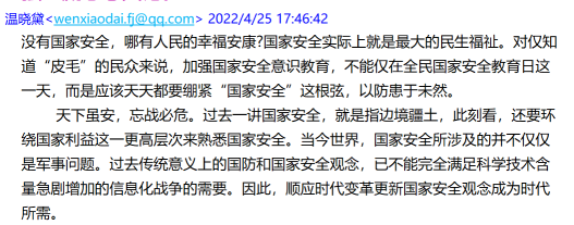 教師黨員溫曉黛同志表示,沒有國家安全,哪有人民的幸福安康?國家安全實際上就是最大的民生福祉。對僅知道“皮毛”的民眾來說,加強國家安全意識教育,不能僅在全民國家安全教育日這一天,而是應該天天都要繃緊“國家安全”這根弦,以防患于未然。
